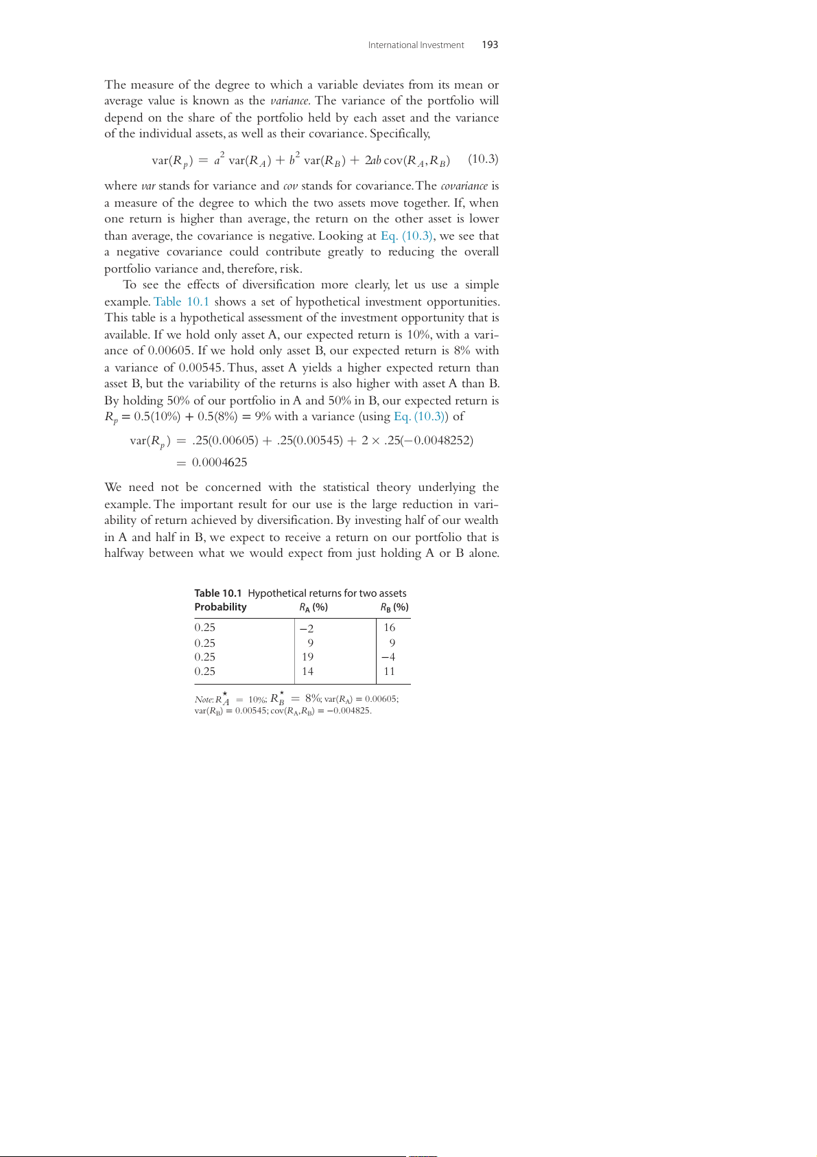 Rp = 0.5(10%) + 0.5(8%) = 9% with a variance (using Eq. (10.3)) of var(R ) = .2 ( 5 . 0 00605) + .2 ( 5 0.0054 ) 5 + 2 × .2 ( 5 − . 0 0048252) p = . 0 0004625