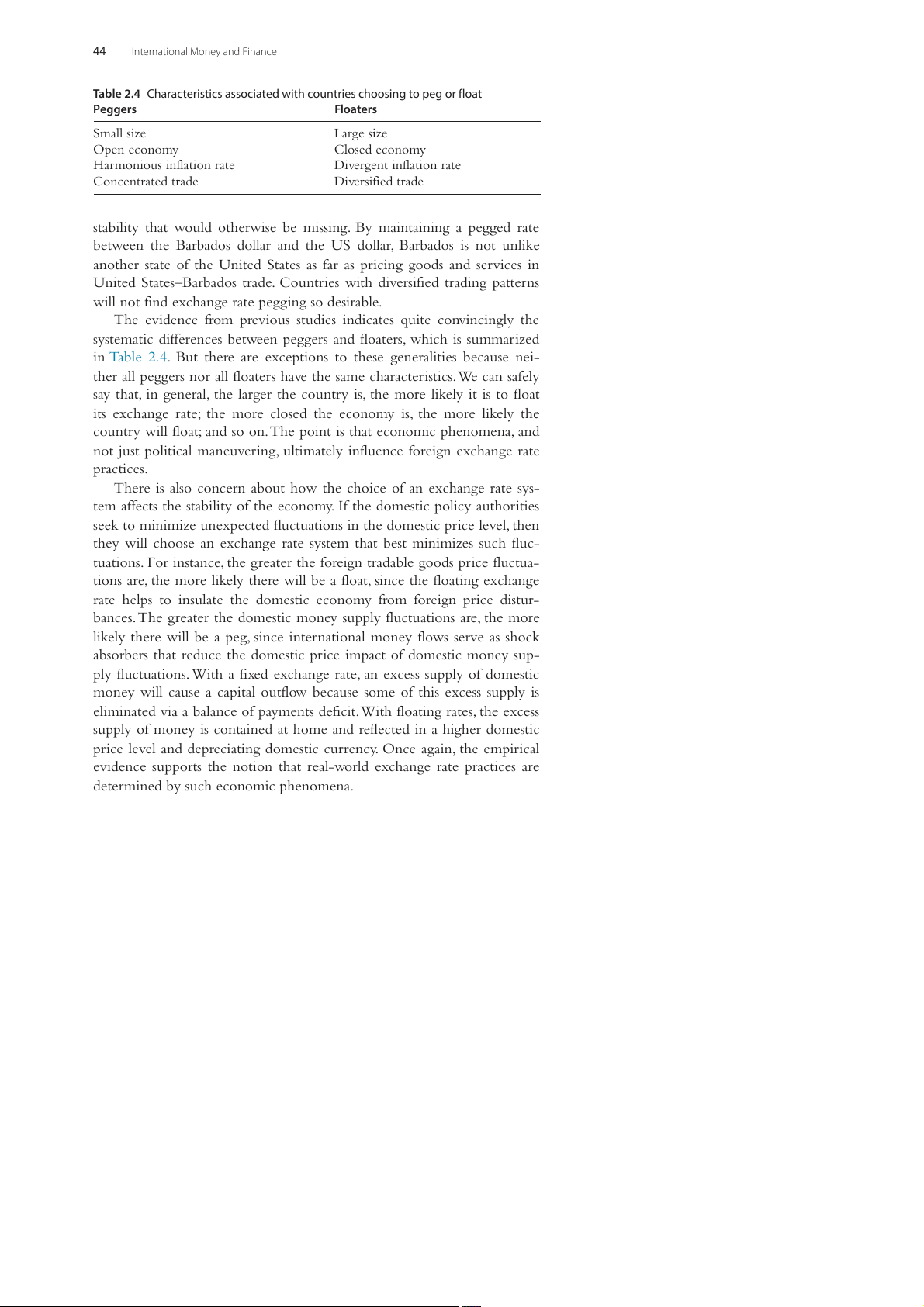 Table 2.4 Characteristics associated with countries choosing to peg or float Peggers Floaters Small size Large size Open economy Closed economy Harmonious inflation rate Divergent inflation rate Concentrated trade Diversified trade