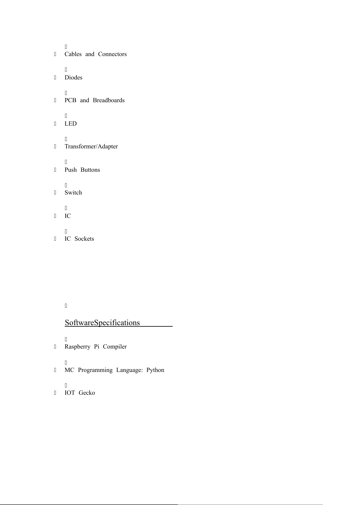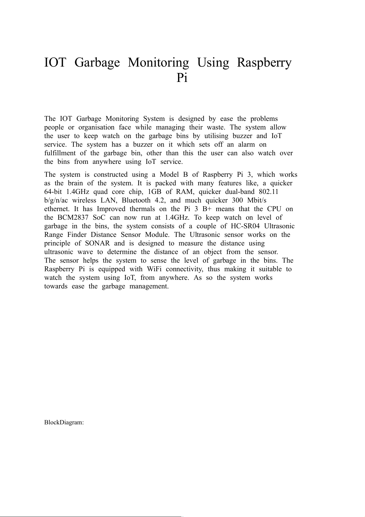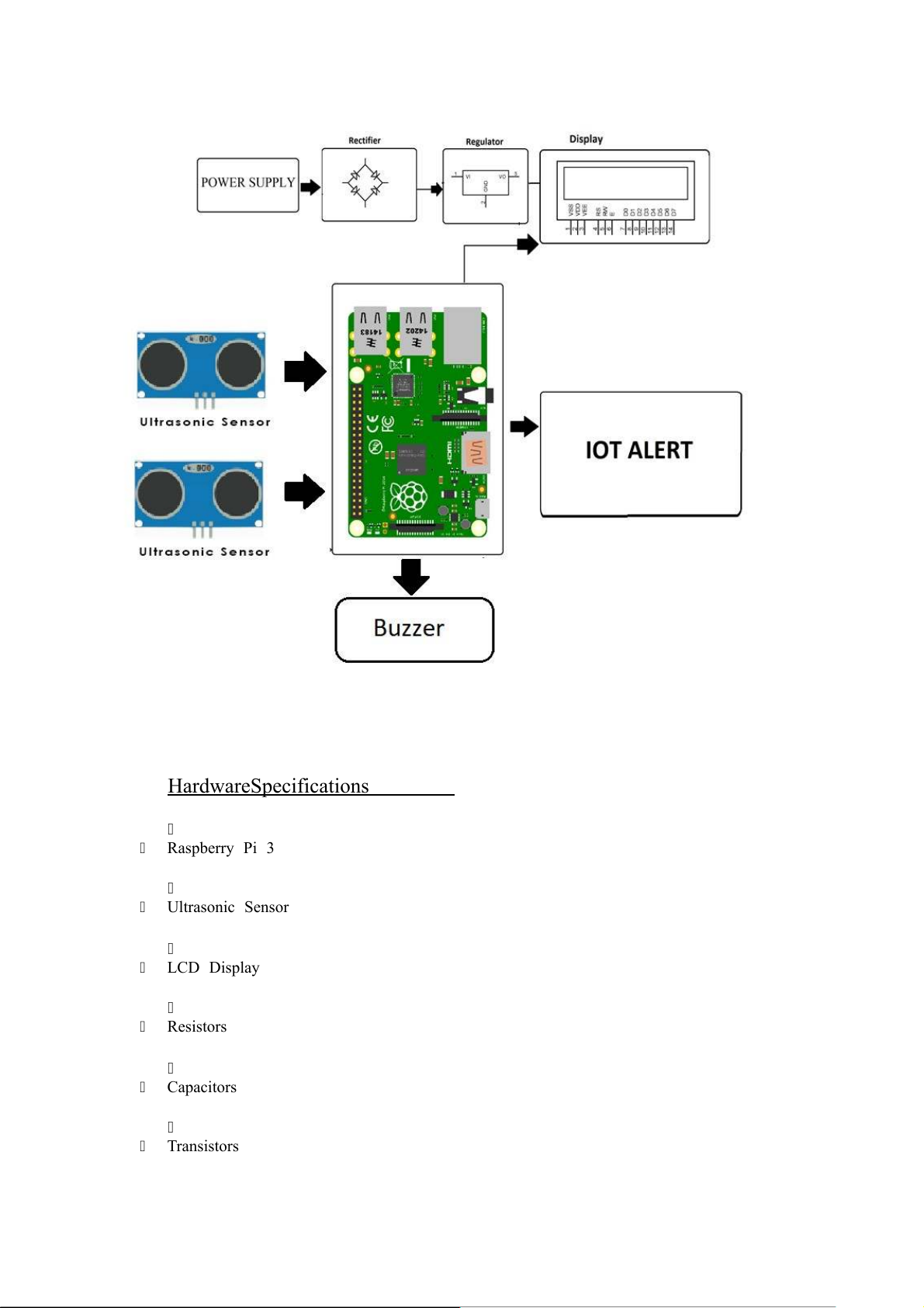 towards ease the garbage management. Block Diagram: Hardware Specifications Raspberry Pi 3 Ultrasonic Sensor LCD Display Resistors Capacitors Transistors Cables and Connectors Diodes PCB and Breadboards LED Transformer/Adapter Push Buttons Switch IC IC Sockets Software Specifications Raspberry Pi Compiler