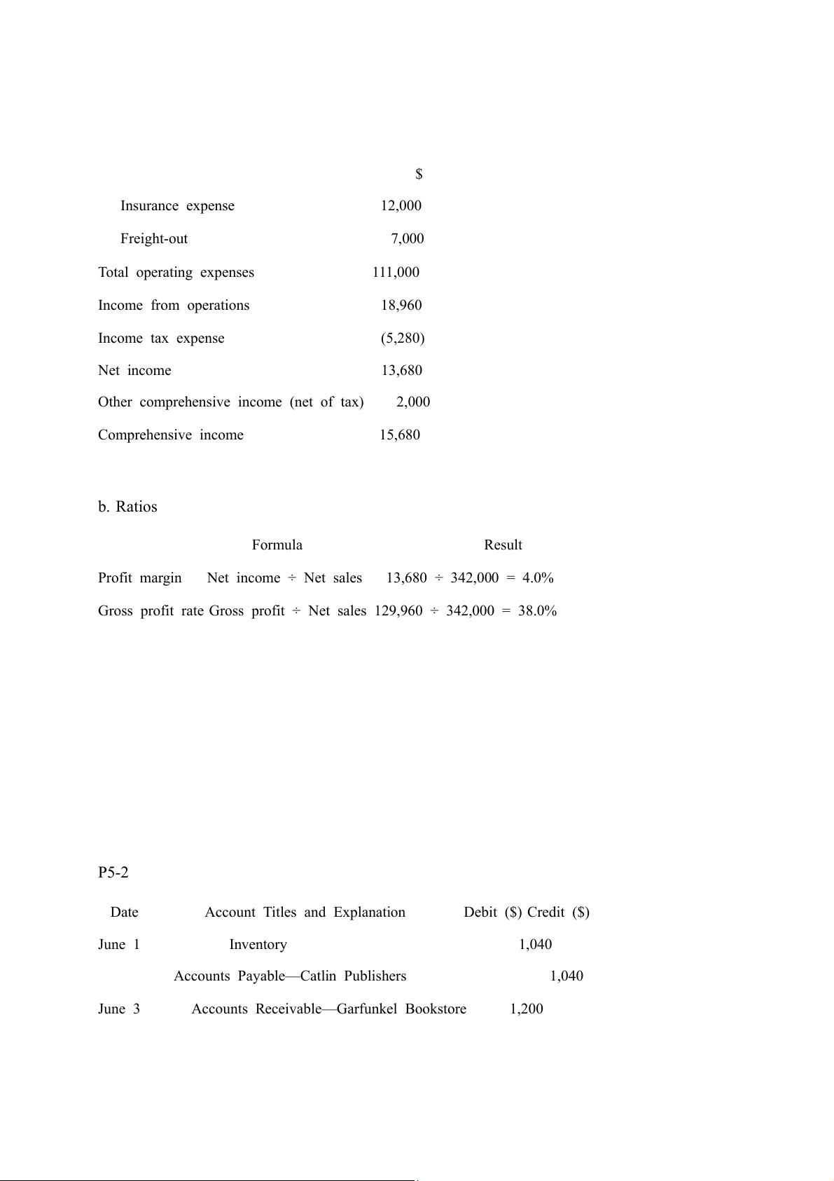 Other comprehensive income (net of tax) 2,000 Comprehensive income 15,680 b. Ratios Formula Result Profit margin Net income ÷ Net sales 13,680 ÷ 342,000 = 4.0%