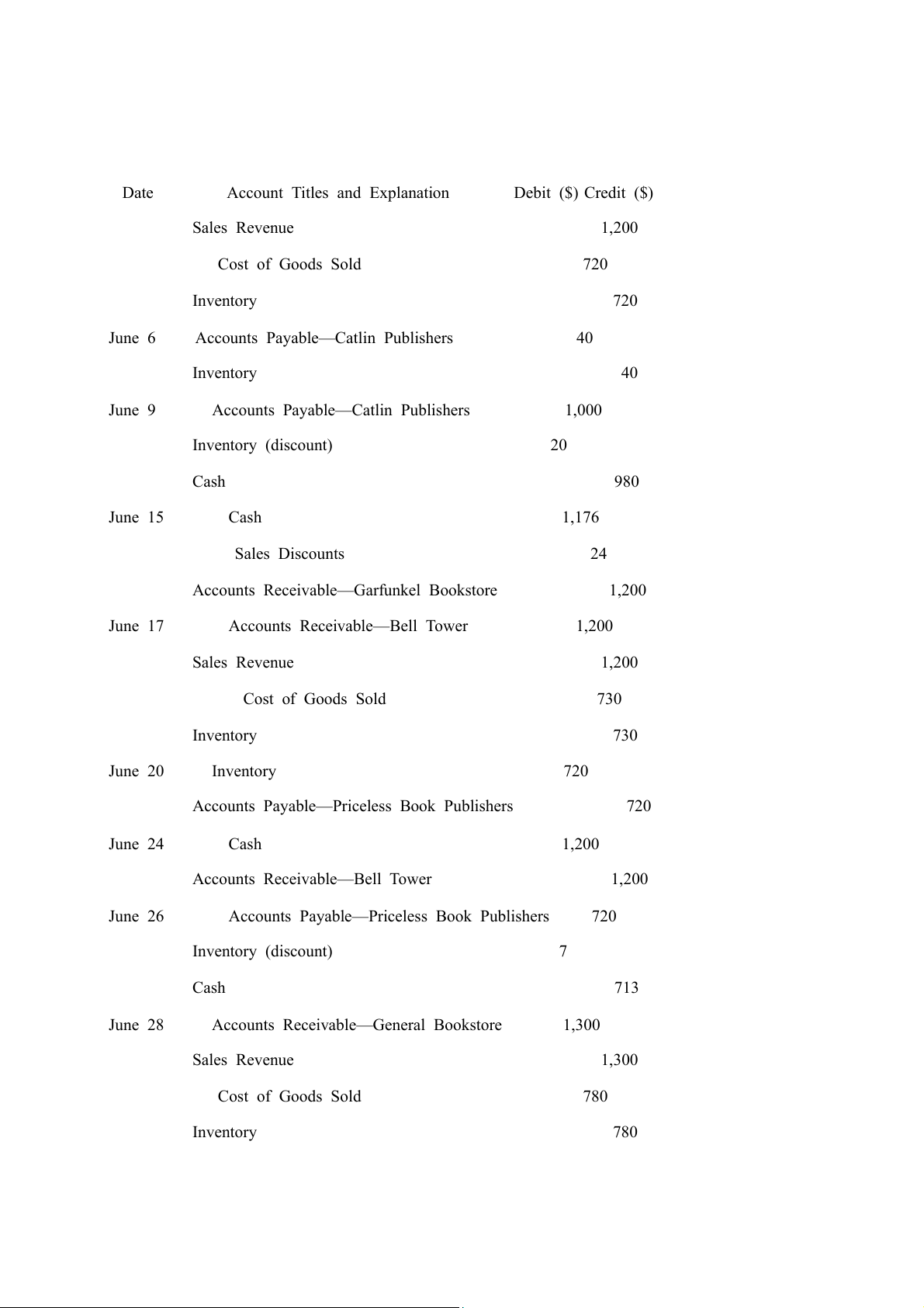 June 26 Accounts Payable—Priceless Book Publishers 720 Inventory (discount) 7 Cash 713