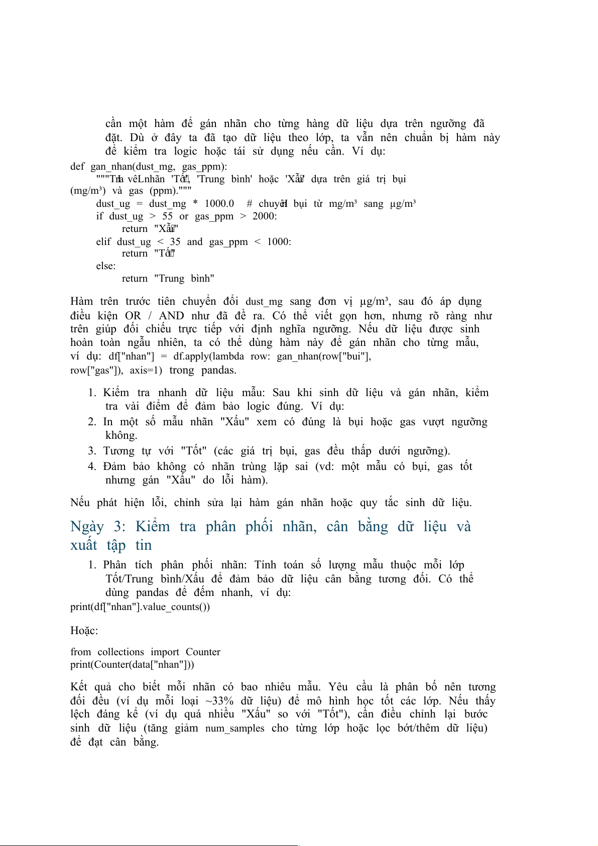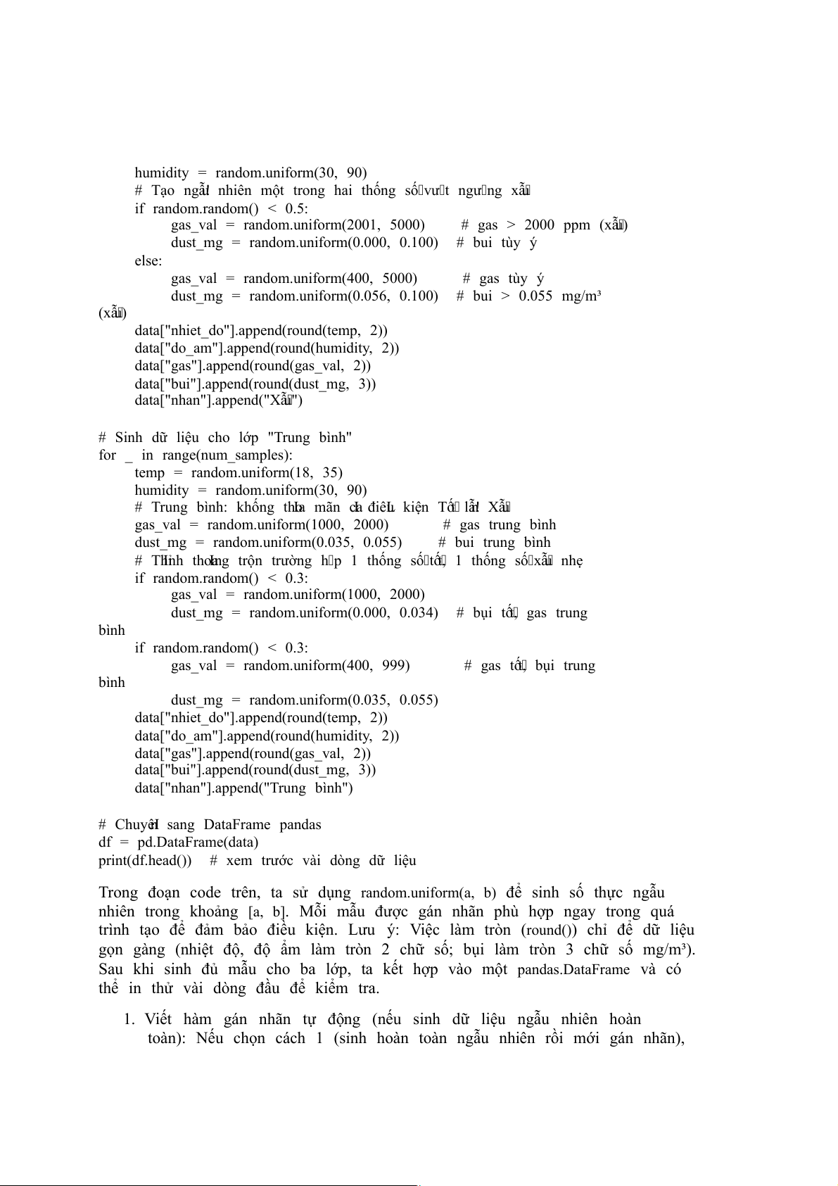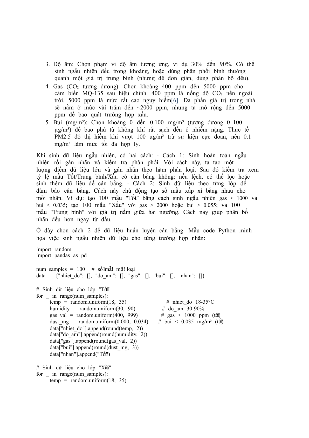 mỗi nhãn. Ví dụ: tạo 100 mẫu "Tốt" bằng cách sinh ngẫu nhiên gas < 1000 và