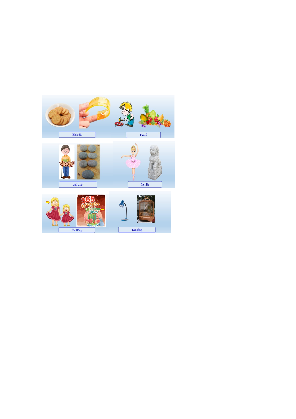 - Nhận xét, tuyên dương. - Dẫn dắt: Chúc mừng cả lớp đã xuất sắc vượt qua các câu hỏi của trò chơi đuổi hình bắt chữ! Và những hình ảnh trong trò chơi gợi nhớ đến một ngày lễ mà các bạn nhỏ như các em rất thích, đó chính là Tết Trung thu. Nhắc đến Tết Trung thu, chắc hẳn ai cũng sẽ nhớ đến những chiếc đèn lồng toả sáng rực rỡ vào đêm trăng rằm. Hôm nay, cô trò chúng ta sẽ cùng nhau trải nghiệm 1 hoạt động thật thú vị: tự tay làm một chiếc đèn lồng xinh xắn nhé! Giới thiệu bài mới Bài 11: Làm đèn lồng. | - Lắng nghe luật chơi - Dự kiến câu trả lời: Hình 1: Bánh dẻo. Hình 2: Phá cổ Hình 3: Chú Cuội. Hình 4:Múa lân. Hình 5: Chị Hằng. Hình 6: Đèn lồng. - Lắng nghe và tán thưởng - Lắng nghe |