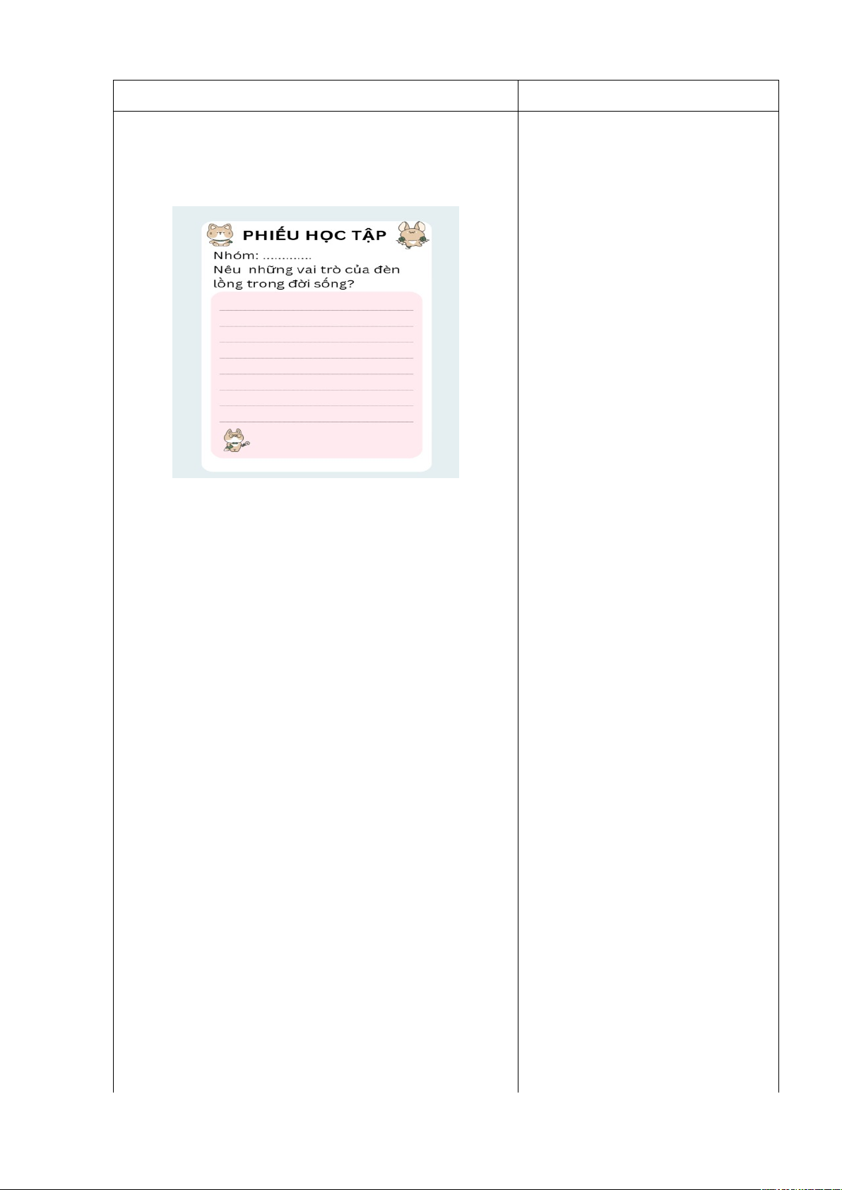 - Mời HS trả lời. - Nhận xét, kết luận và giới thiệu cơ bản về các loại đèn lồng. Trên đây là các loại đèn lồng thông dụng: đèn lồng giấy xếp, đèn lồng cá chép, đèn lồng kéo quân, đèn lồng tròn, đèn lồng quả trám, đèn lồng ông sao. 2.2. Vai trò của đèn lồng.(7 phút) - Tổ chức cho HS thảo luận nhóm 4 hoàn thành phiếu học tập trong vòng 3 phút:
