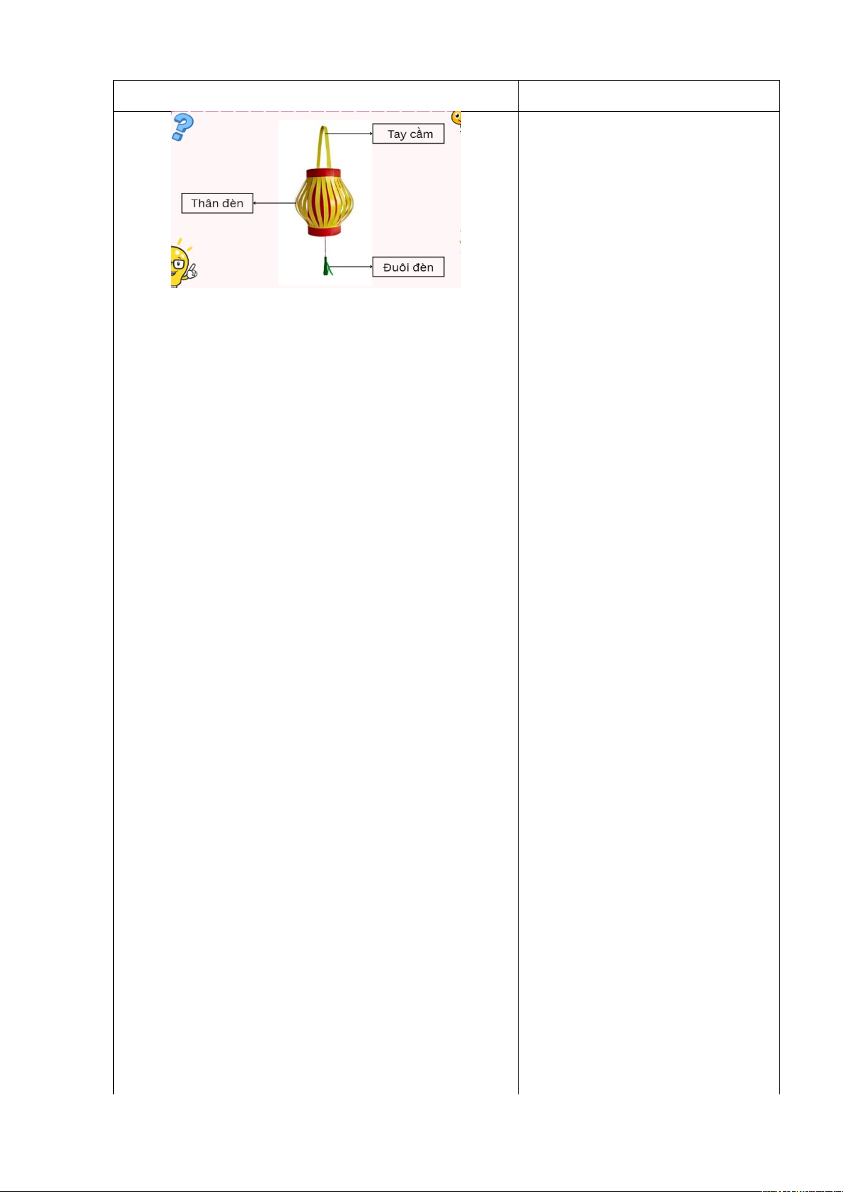 + Giấy thủ công, giấy bìa màu làm thân đèn, ống hút là trụ thân đèn, len(sợi chỉ) để làm đuôi đèn, thước kẻ, bút chì dùng để đo kích thước lồng đèn, bút màu dùng để trang trí lồng đèn. Kéo, keo sữa dùng để cắt dán lồng đèn * Củng cố, dặn dò - Yêu cầu học sinh nhắc lại về các loại đèn lồng và cấu tạo của đèn lồng. - Dặn dò HS chuẩn bị vật liệu cần thiết cho tiết học sau. | - HS quan sát hình ảnh - Dự kiến câu trả lời: đèn lồng giấy xếp, đèn lồng cá chép, đèn lồng kéo quân, đèn lồng tròn, đèn lồng quả trám, đèn lồng ông sao. - Lắng nghe. - Thảo luận nhóm 4 hoàn thành phiếu học tập - Đại diện nhóm trình bày: Đèn lồng có nhiều vai trò như là: trang trí, biểu tượng văn hoá, sản phẩm thủ công truyền thống lâu đời, thắp sáng, nghi lễ tôn giáo,… - Nhận xét - Lắng nghe - Quan sát SGK kết hợp với sản phẩm mẫu để xác định các bộ phận của đèn lồng. - Lên xác định các bộ phận của đèn lồng. - Lắng nghe. - Quan sát vật mẫu kết hợp sgk, thảo luận nhóm 4 thực hiện yêu cầu của GV. - Đại diện nhóm trình bày. Dự kiến câu trả lời: Giấy thủ công, giấy bìa màu làm thân đèn, ống hút giấy, len (hoặc chỉ), thước kẻ, bút chì, bút màu, kéo, keo sữa. - Dự kiến câu trả lời: Giấy thủ công, giấy bìa màu, ống hút là trụ thân đèn, len(sợi chỉ) để làm đuôi đèn, thước kẻ, bút chì dùng để đo kích thước lồng đèn, bút màu dùng để trang trí lồng đèn. Kéo, keo sữa dùng để cắt dán lồng đèn - Lắng nghe. - Nhắc lại. - Lắng nghe |
