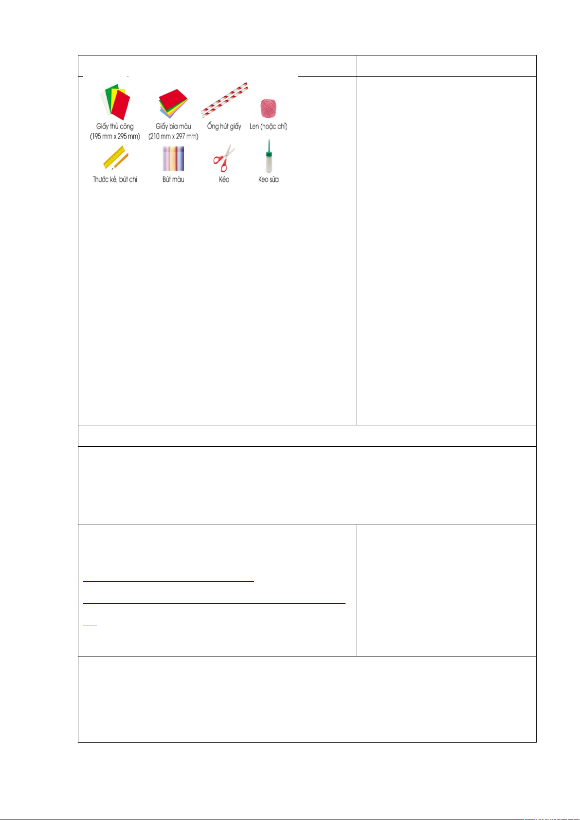 - Giấy thủ công, kéo, thước, bút, keo dán, giấy bìa màu, ống hút giấy, len hoặc chỉ, bút màu.