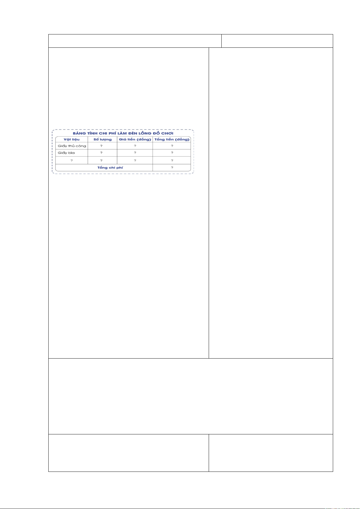- Mời đại diện các nhóm lên giới thiệu cho cả lớp về chiếc đèn lồng của nhóm mình dựa vào các câu hỏi gợi mở: + Đèn lồng được làm bằng chất liệu gì? + Ý tưởng để làm chiếc đèn lồng? + Đèn lồng được trang trí như thế nào? - Mời HS nhận xét, chia sẻ. - Nhận xét, tuyên dương. - Cho HS bình chọn sản phẩm dựa vào phiếu đánh giá. - Nhận xét, tuyên dương cả lớp, khen thưởng các nhóm có số bình chọn nhiều nhất. - Kết luận: Đèn chắc chắn, giữ được thăng bằng, quai xách ở vị trí phù hợp,màu sắc hài hòa. 3.4. Tính toán chi phí làm đèn lồng (10 phút) - Gợi ý cho các nhóm thảo luận nhóm 4 trong thời gian 5 phút: thống nhất cách tính chi phí đồ chơi tự làm.