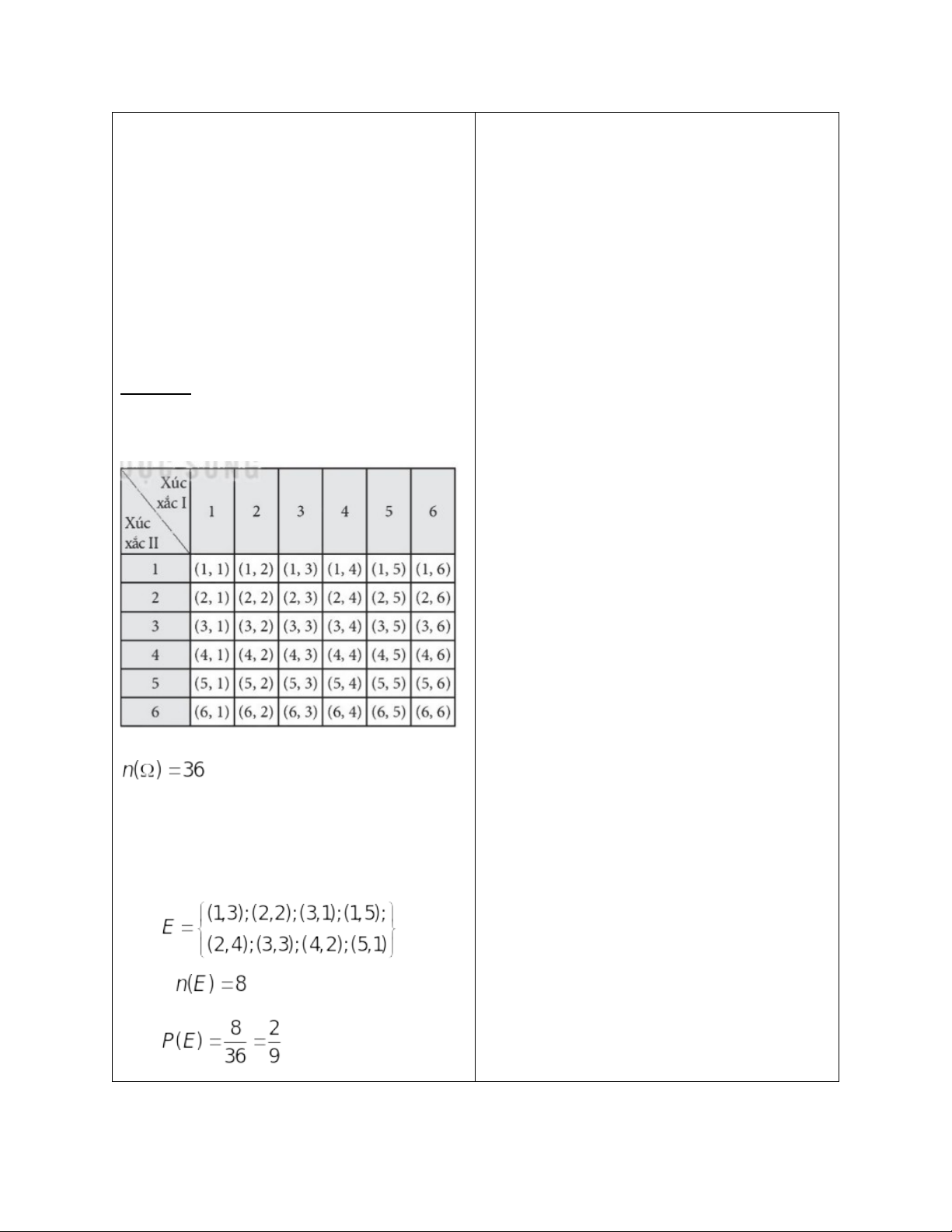 Mỗi ô là một kết quả có thể. Ta có Biến cố E: “Tổng số chấm xuất hiện trên hai con xúc xắc bằng 4: (1,3); (2,2); hoặc (3,1) hay các ô có tổng bằng 6: (1,5); (2,3); (3,3); (4,2) hoặc (5,1). Vậy Từ đó Vậy | - GV yêu cầu HS tính xác suất của biến cố theo định nghĩa cổ điển ở Ví dụ 5 (SGK trang 81). - GV nhấn mạnh một số chú ý sau: Trong định nghĩa cổ điển của xác suất có giả thuyết quan trọng là các kết quả có thể của phép thử T là đồng khả năng. - GV triển khai nhiệm vụ Luyện tập 3 (SGK trang 81) cho học sinh. - GV nhận xét, đánh giá. |
