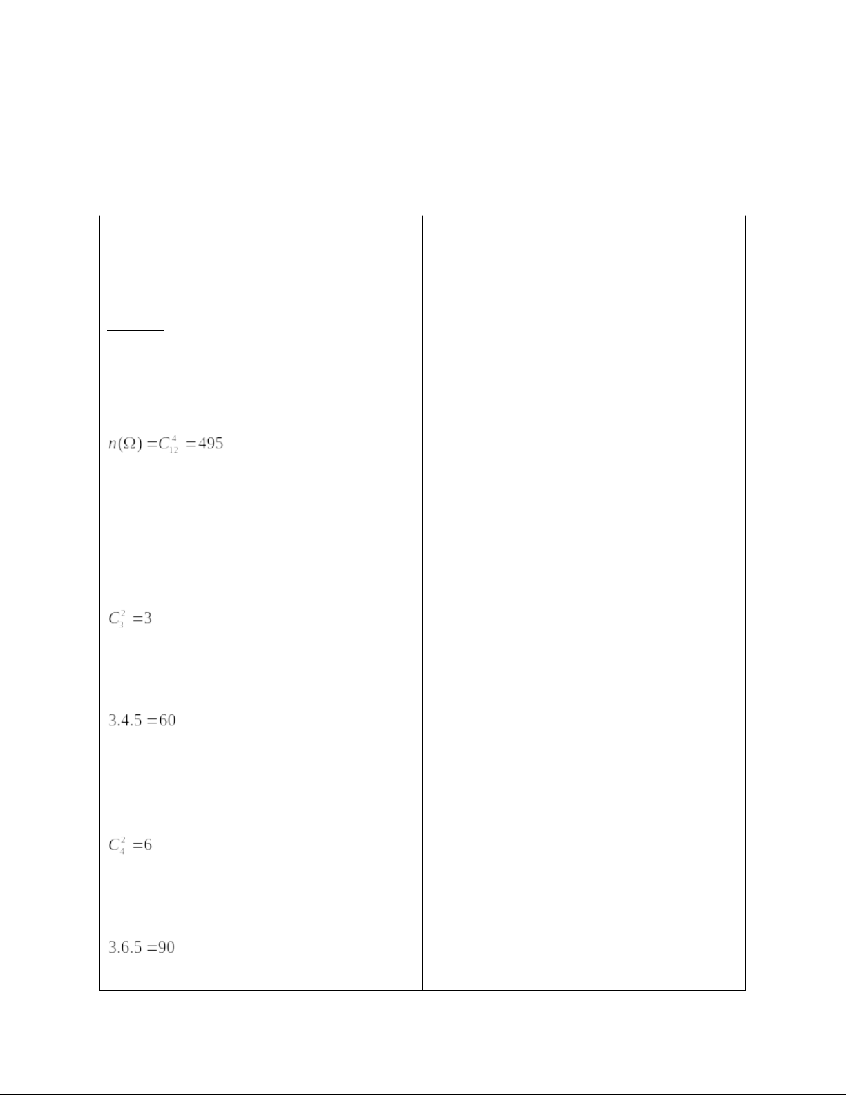 - Học sinh thực hiện trả lời câu hỏi, thảo luận theo nhóm đôi. Lời giải: Mỗi cách chọn ra đồng thời 4 bông hoa là một tổ hợp chập 4 của 12 phần tử. Do đó, không gian mẫu Ω gồm các tổ hợp chập 4 của 12 phần tử Gọi A là biến cố "Bốn bông hoa chọn ra có cả ba màu". Có 3 trường hợp xảy ra: Trường hợp 1: Chọn ra 2 bông hoa màu trắng, 1 bông hoa màu vàng, 1 bông hoa màu đỏ. Số cách chọn ra 2 bông hoa màu trắng là: Số cách chọn ra 2 bông hoa màu trắng, 1 bông hoa màu vàng, 1 bông hoa màu đỏ là: