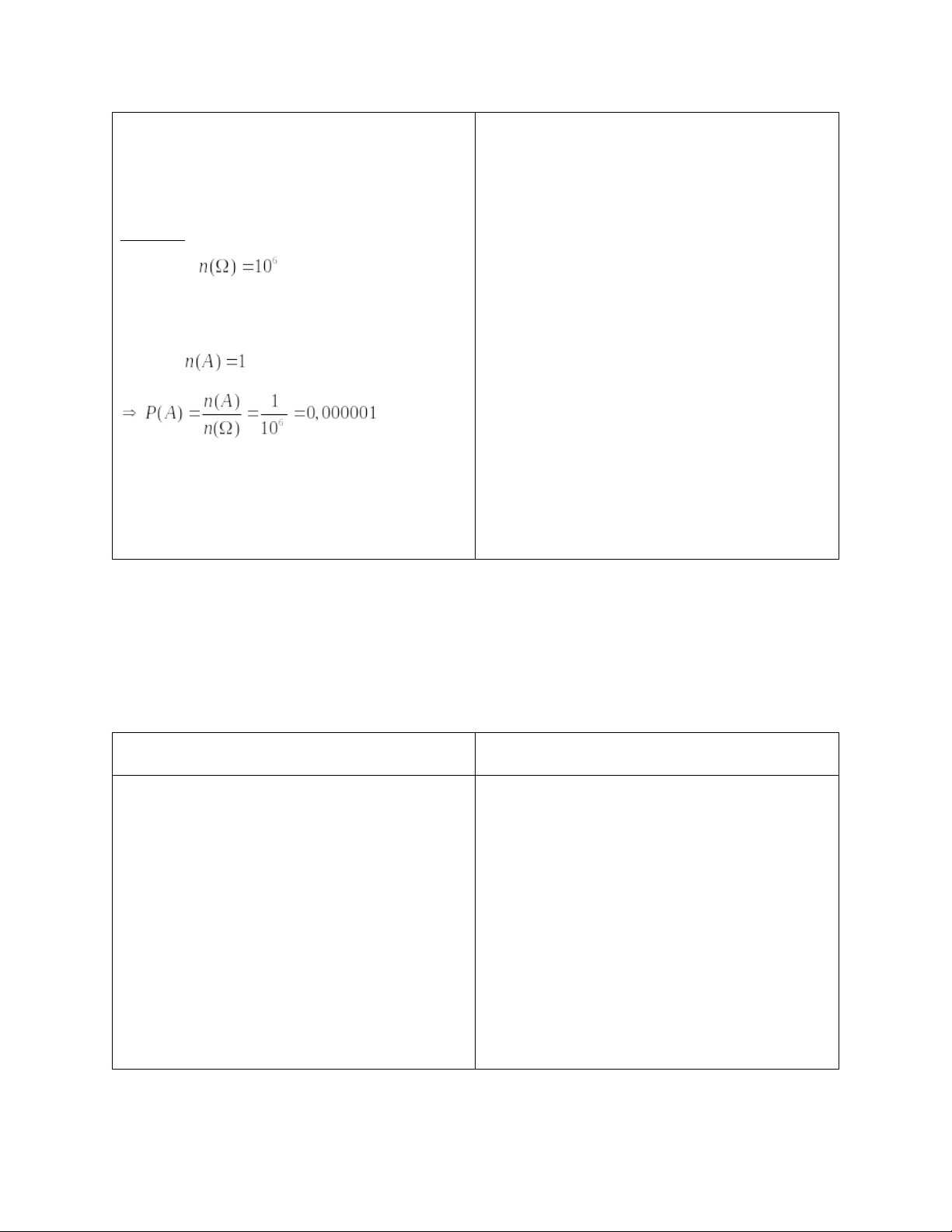 - HS lắng nghe, quan sát. - HS trả lời câu hỏi. Lời giải: a) Ta có: Gọi biến cố A: “ người đó trúng số độc đắc”. Suy ra: b) Muốn trúng độc đắc không nên mua một tờ vé số. | - GV đưa ra một số ví dụ trong thực tế về những biến cố có xác suất rất bé (video). Link video: Chẳng hạn, xác suất xảy ra sự cố rơi máy bay, xác suất một chiếc điện thoại bị lỗi kĩ thuật,… - GV yêu cầu HS thực hiện câu hỏi Một người mua một tờ vé số. Biết rằng trên mỗi tờ vé số có một dãy số có 6 chữ số chứa các số từ 0 đến 9. Giả thiết có một dãy số là số độc đắc; trên mỗi tờ vé số là một dãy số khác nhau; tất cả các dãy số có thể xuất hiện đều được phát hành. a) Tính xác suất để người này trúng số độc đắc. b) Muốn trúng độc đắc, có nên mua một tờ vé số không? - GV nhận xét, đánh giá. |