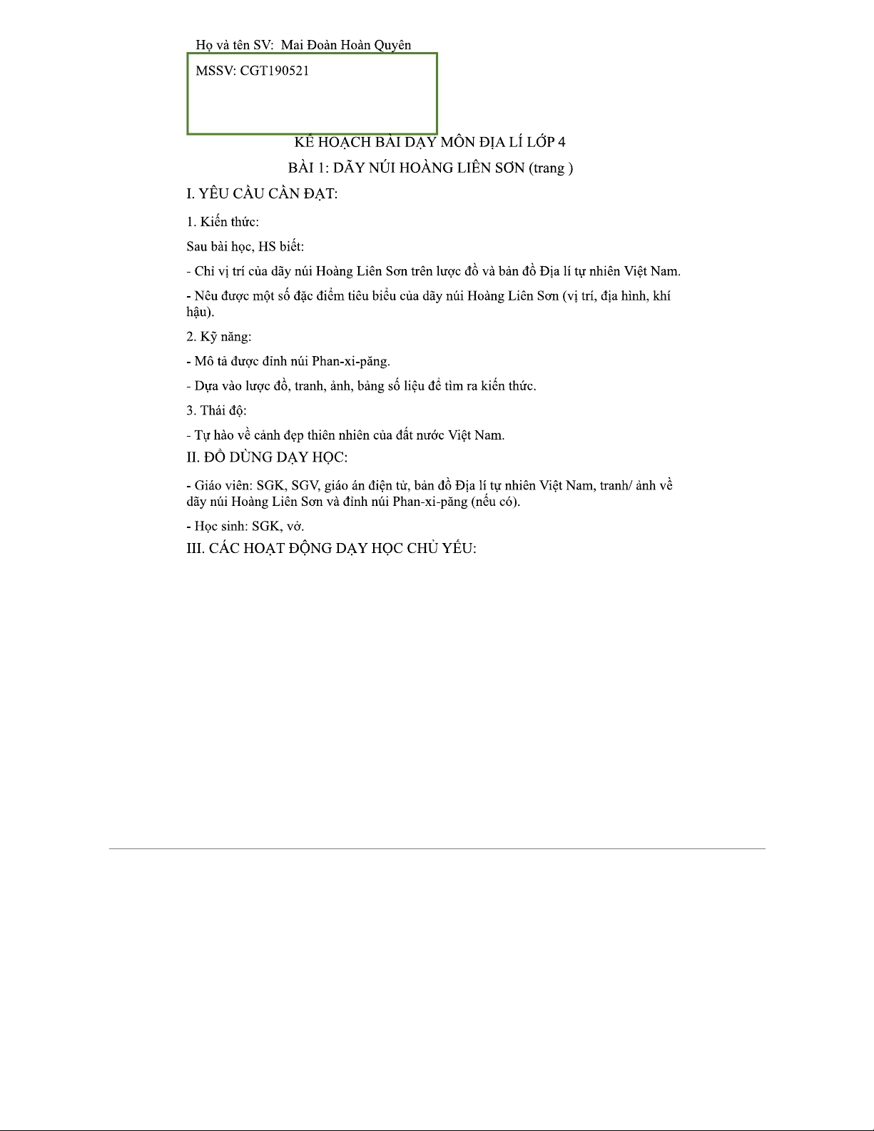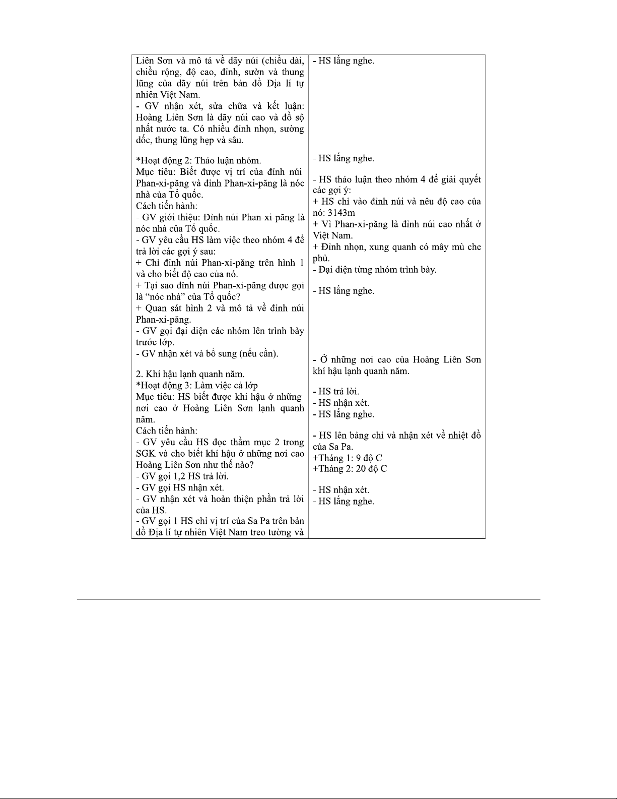 KẾ HOẠCH BÀI DẠY ĐỊA LÍ LỚP 4: DÃY NÚI HOÀNG LIÊN SƠN