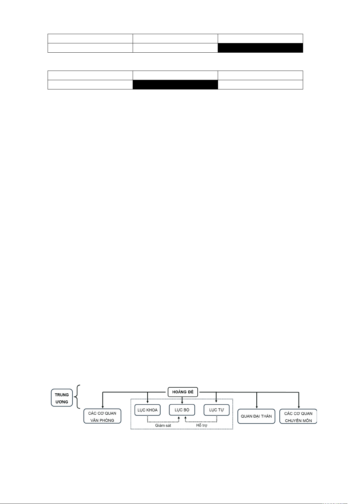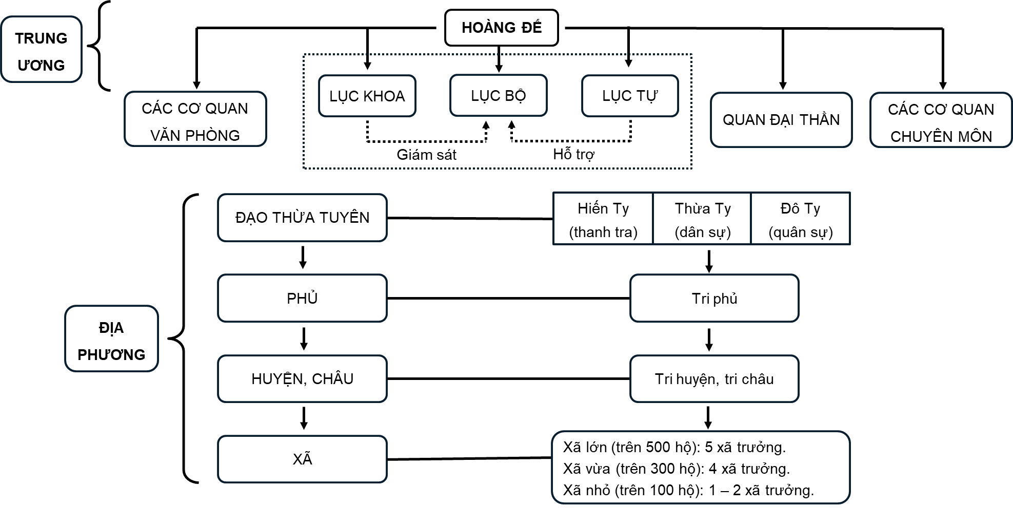 Tổ chức bộ máy trung ương: Tổ chức nhà nước trung ương: Triều đình được tổ chức với 6 bộ chính: Lại, Hộ, Lễ, Binh, Hình, Công. Đứng đầu mỗi bộ là Thượng thư. Ngoài ra, còn có các cơ quan chuyên môn như Hàn lâm viện, Quốc sử viện, và Ngự sử đài
