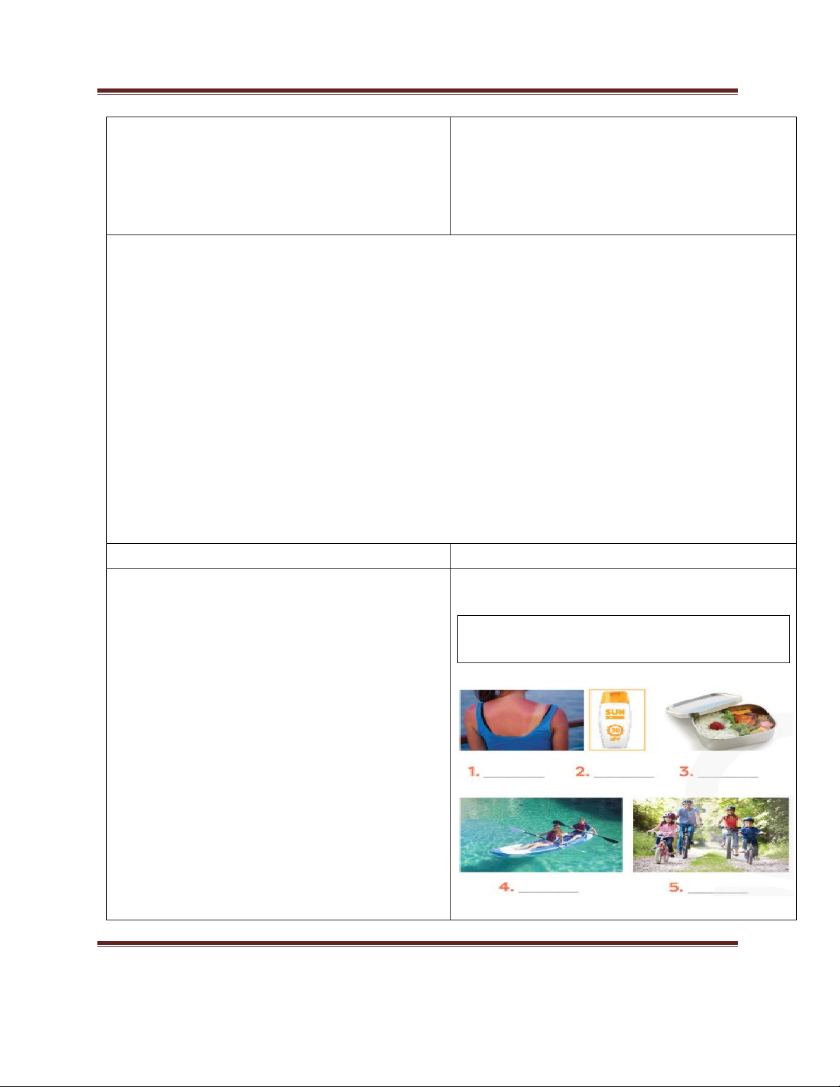 boat, suncream, lunchbox, cycle, popular,bring along, get sunburn,be good / bad for