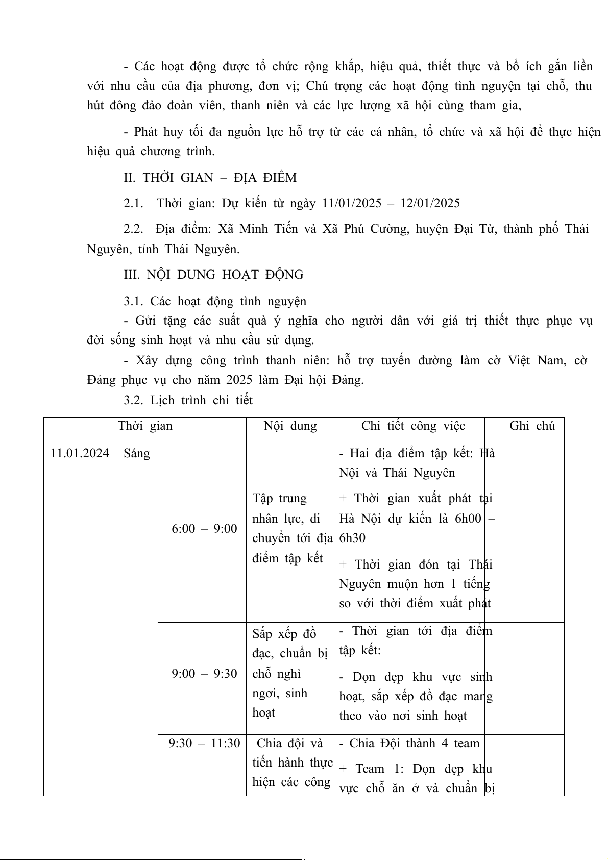 2.1. Thời gian: Dự kiến từ ngày 11/01/2025 – 12/01/2025