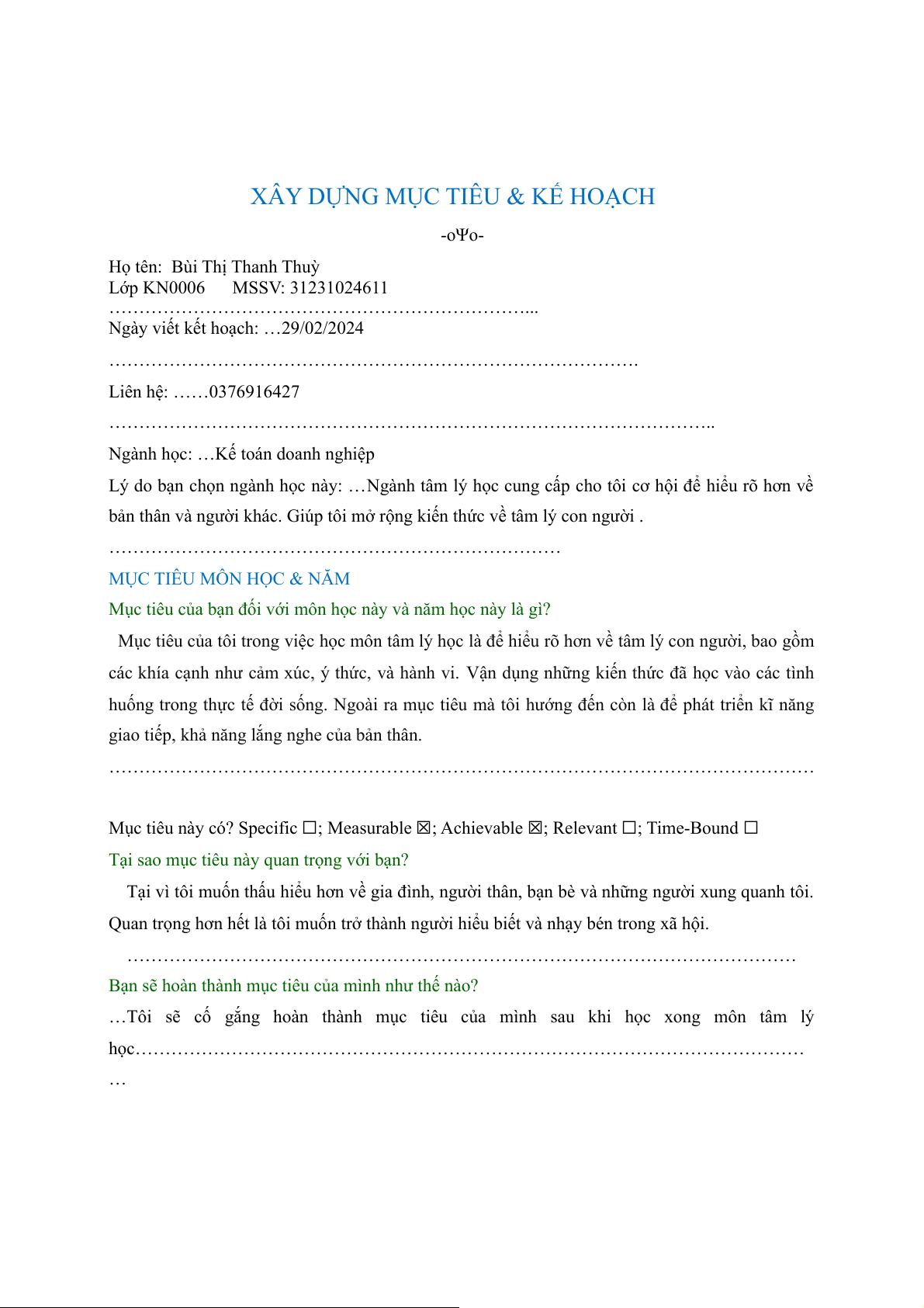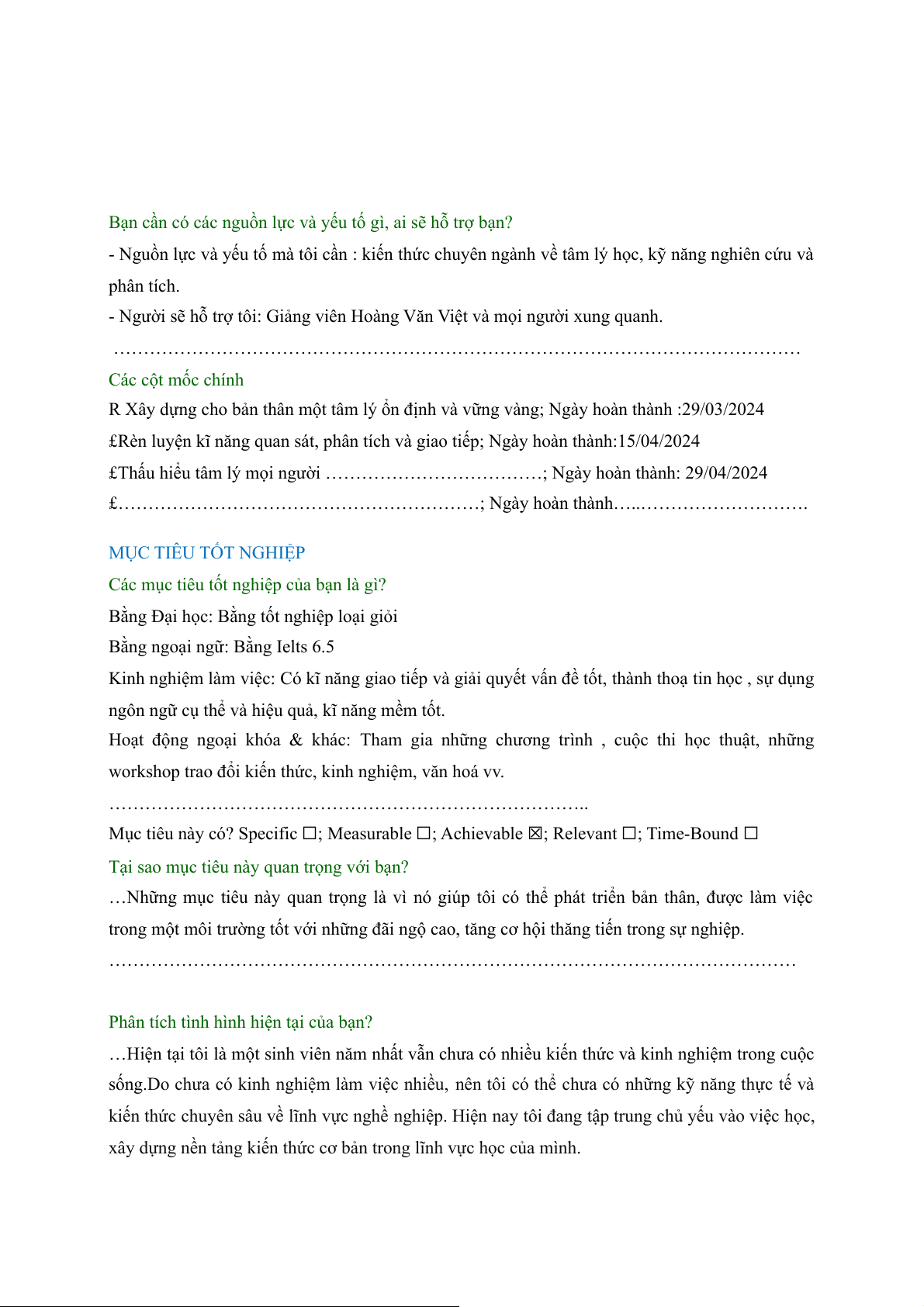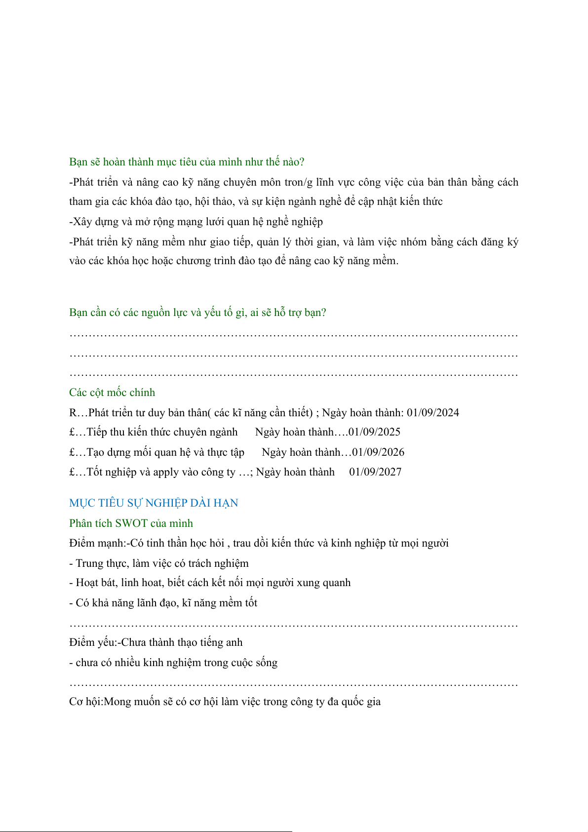 Ngắn hạn (1-2 năm): Mục tiêu trong 2 năm tới là sẽ cố gắng học tập và tốt nghiệp với tấm bằng giỏi.