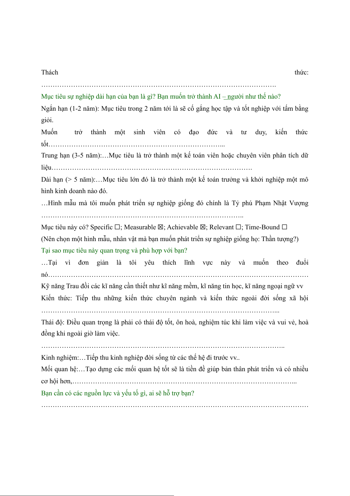 Dài hạn (> 5 năm):…Mục tiêu lớn đó là trở thành một kế toán trưởng và khởi nghiệp một mô hình kinh doanh nào đó.