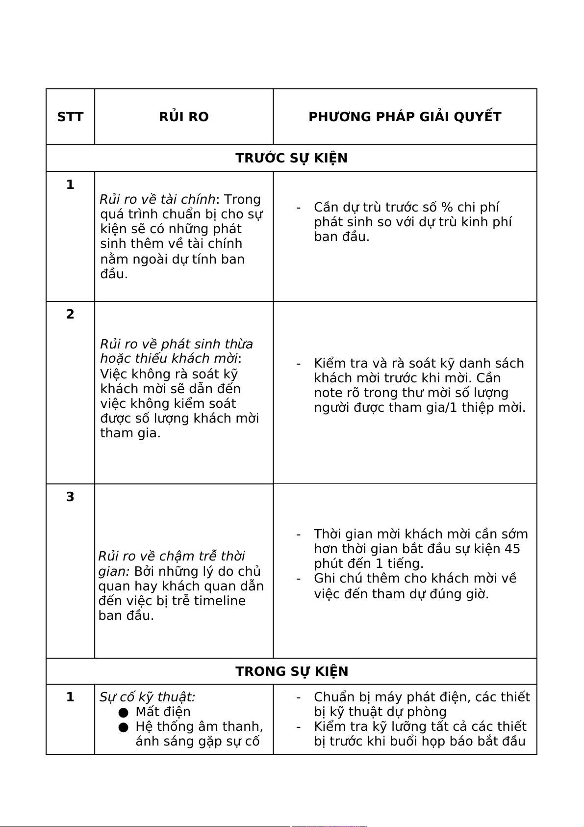 bị trước khi buổi họp báo bắt đầu ● Máy chiếu bị hư hỏng, File trình chiếu bị lỗi ● Bộ đàm hết pin không thể trao đổi thông tin khẩn cấp trong ban tổ chức