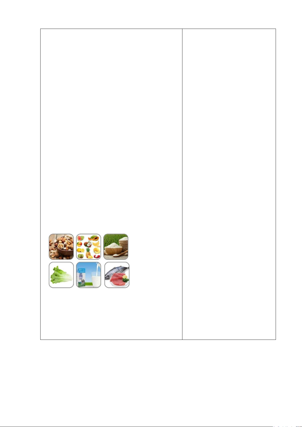 + Thực phẩm lành mạnh: rau xanh, trái cây, cơm,  sữa, cá, ngũ cốc...