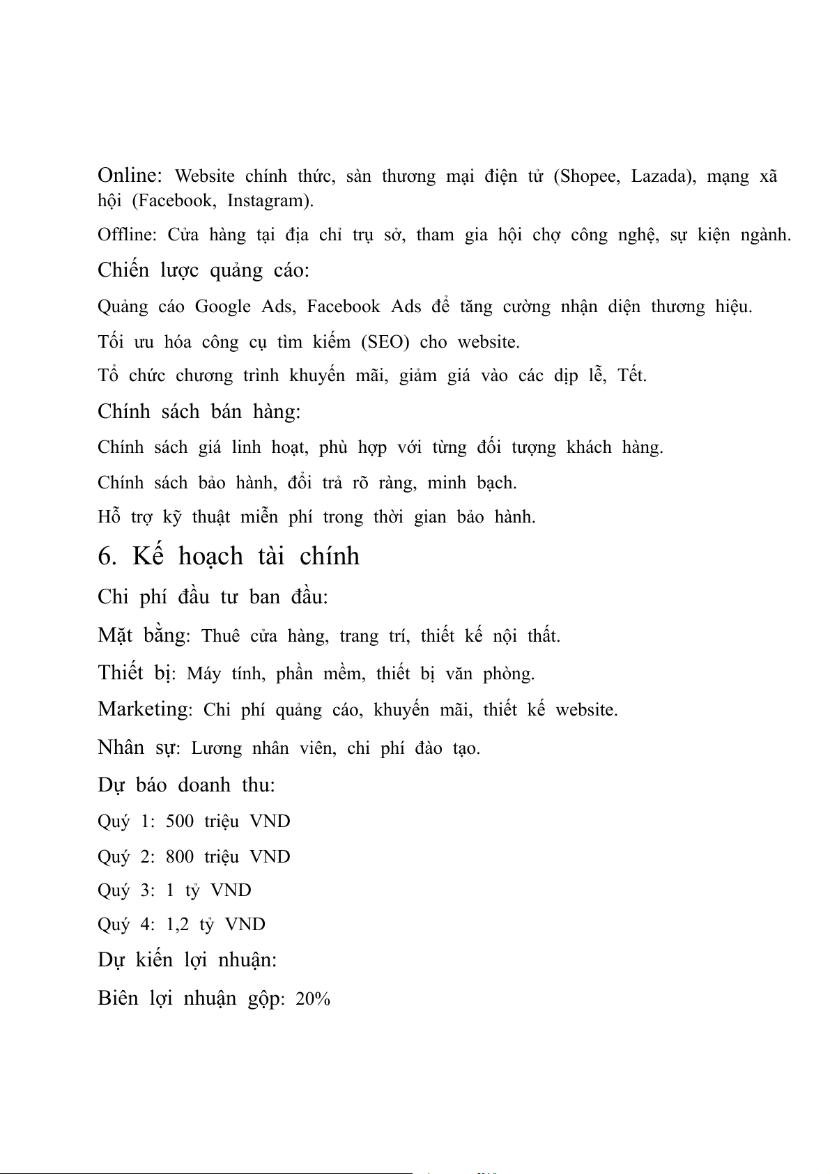 Hỗ trợ kỹ thuật miễn phí trong thời gian bảo hành. 6. Kế hoạch tài chính