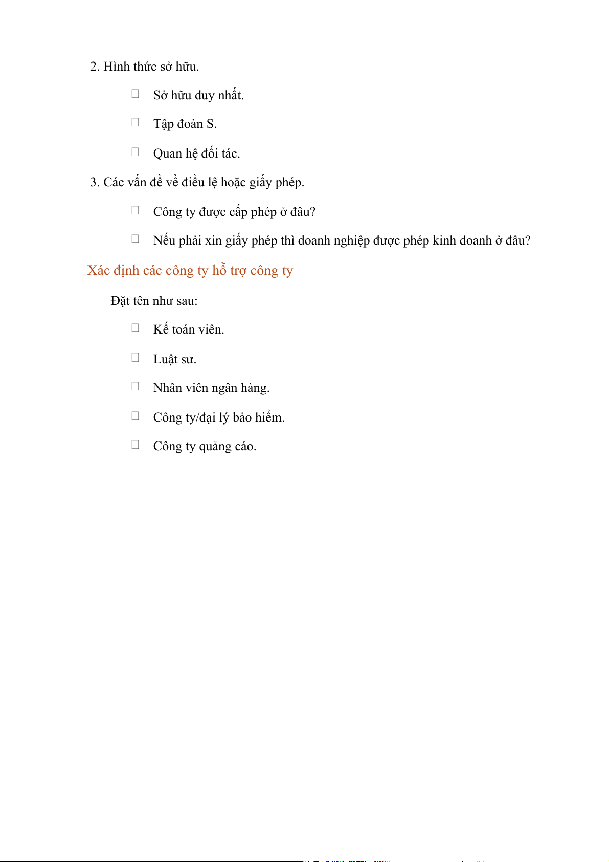 1. Cung cấp sơ đồ tổ chức đầy đủ ở phần phụ lục nhưng hãy tham khảo tại đây. Tên của cá nhân. Tiêu đề của vị trí. Tuổi của cá nhân. 2. Hình thức sở hữu. Sở hữu duy nhất. Tập đoàn S. Quan hệ đối tác.