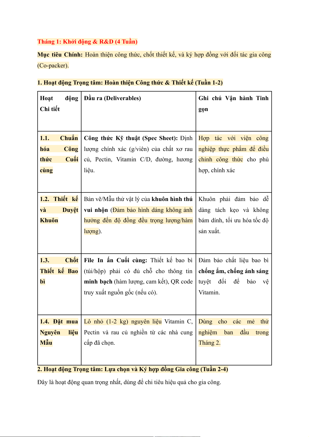 1. Hoạt động Trọng tâm: Hoàn thiện Công thức & Thiết kế (Tuần 1-2) Hoạt