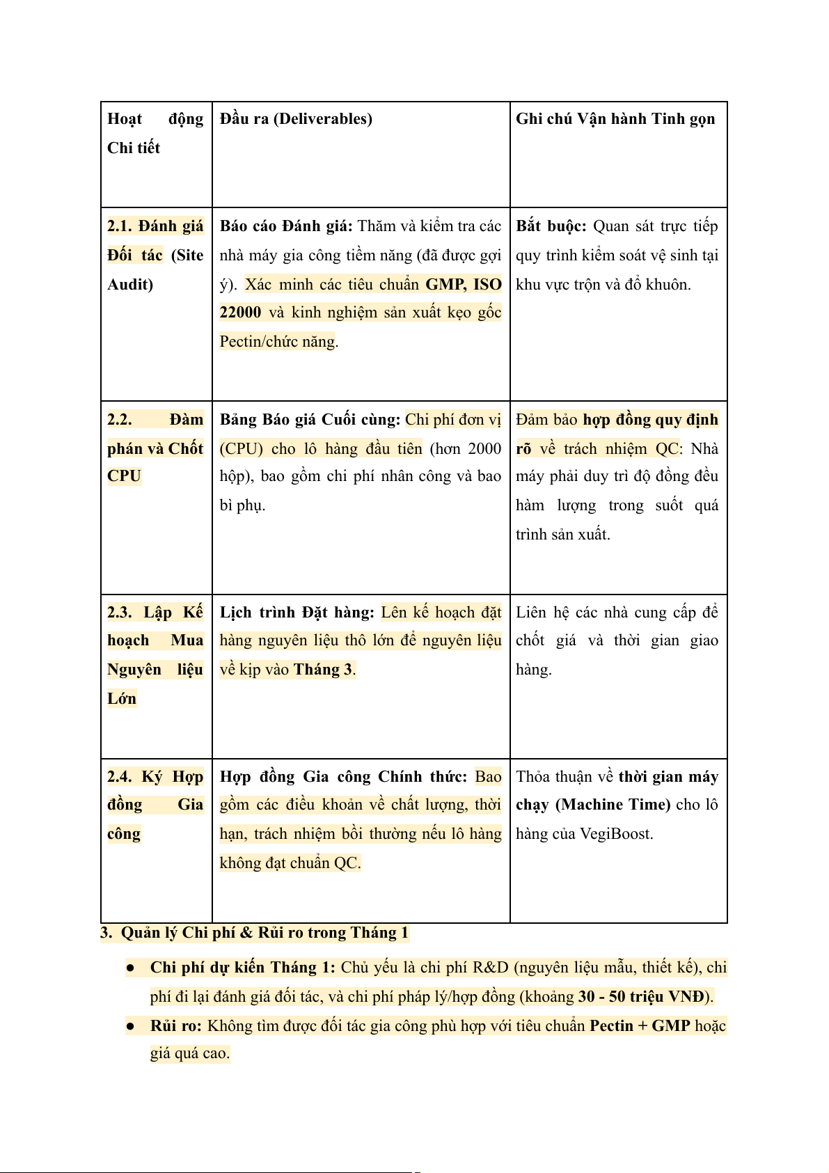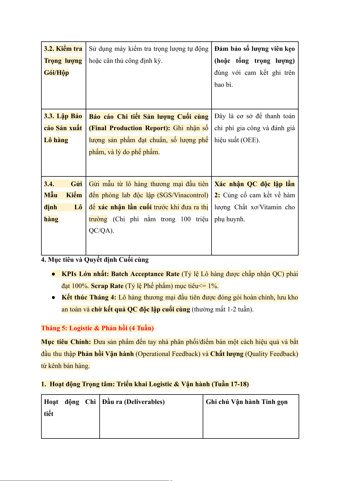 Mục tiêu Chính: Hoàn thiện công thức, chốt thiết kế, và ký hợp đồng với đối tác gia công (Co-packer).