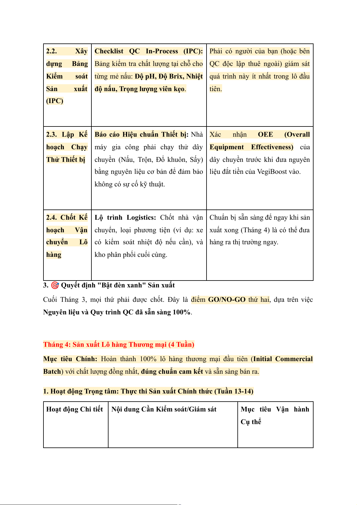 Mục tiêu Chính: Đảm bảo toàn bộ nguyên vật liệu, bao bì và quy trình QC đã sẵn sàng