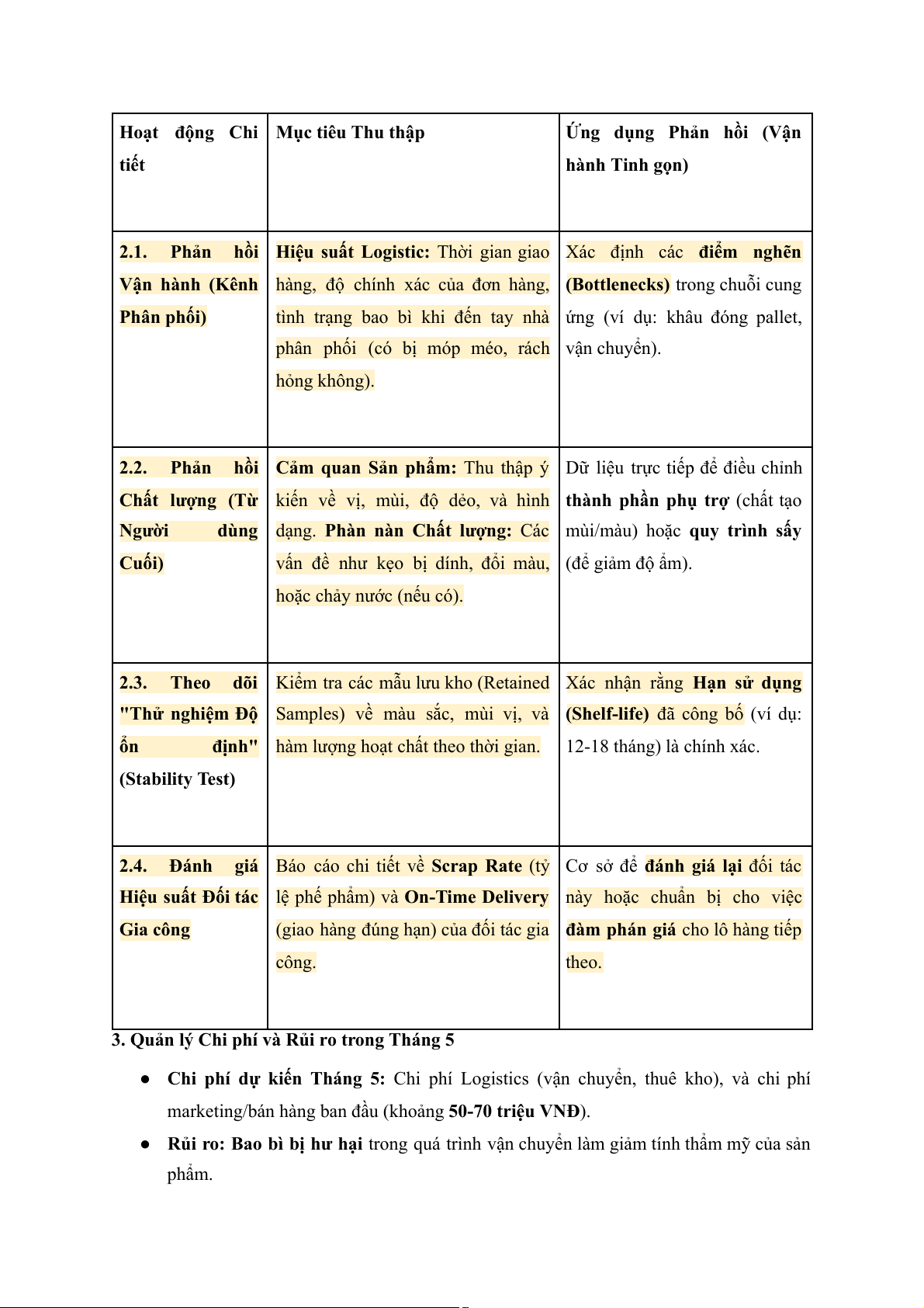 ● Chi phí dự kiến Tháng 5: Chi phí Logistics (vận chuyển, thuê kho), và chi phí