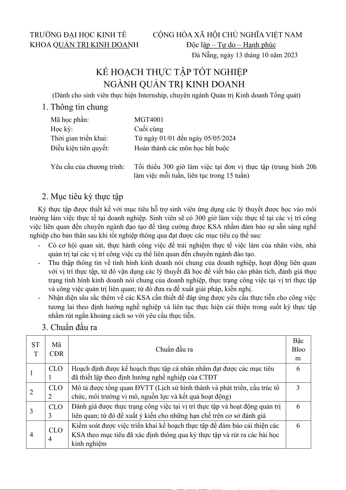 (Dành cho sinh viên thực hiện Internship, chuyên ngành Quản trị Kinh doanh Tổng quát) 1. Thông tin chung Mã học phần: MGT4001 Học kỳ: Cuối cùng Thời gian triển khai: