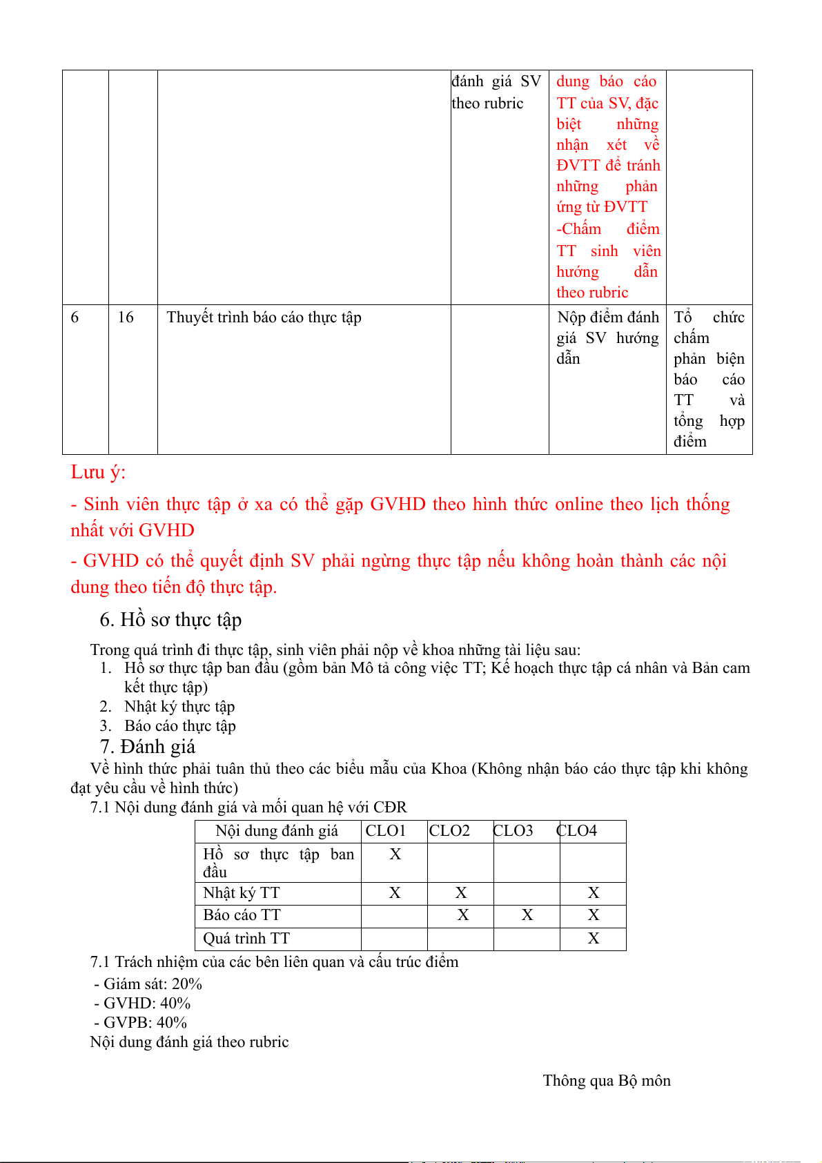 7.1 Nội dung đánh giá và mối quan hệ với CĐR Nội dung đánh giá CLO1 CLO2 CLO3 CLO4 Hồ sơ thực tập ban X đầu Nhật ký TT X X X Báo cáo TT X X X Quá trình TT X
