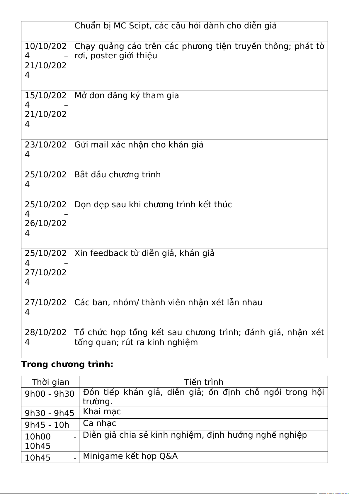 15/09/202 Lên ý tưởng và xây dựng kế hoạch tổ chức, lập bảng dự trù 4 – kinh phí. 21/09/202 4