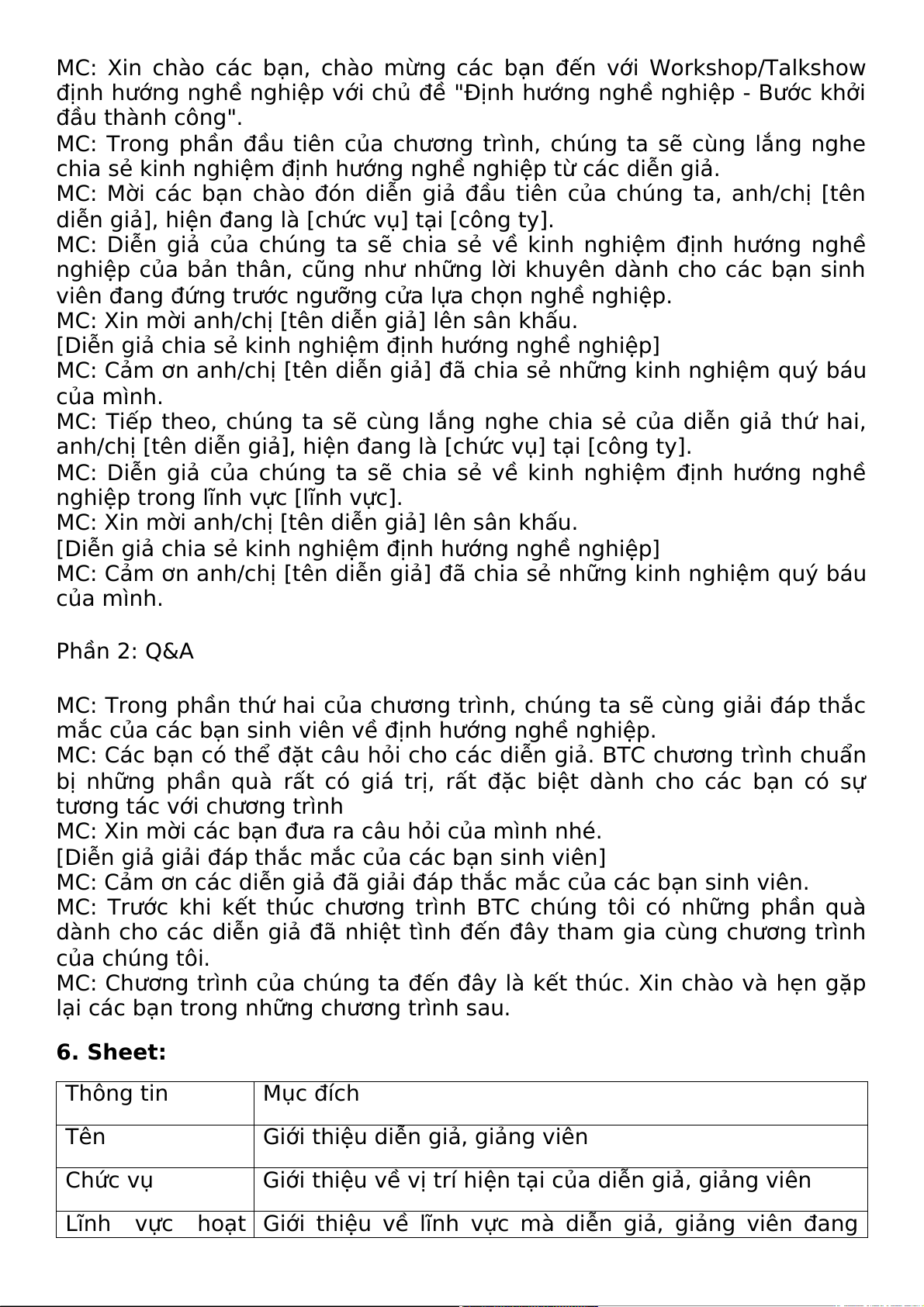 Chuẩn bị MC Scipt, các câu hỏi dành cho diễn giả