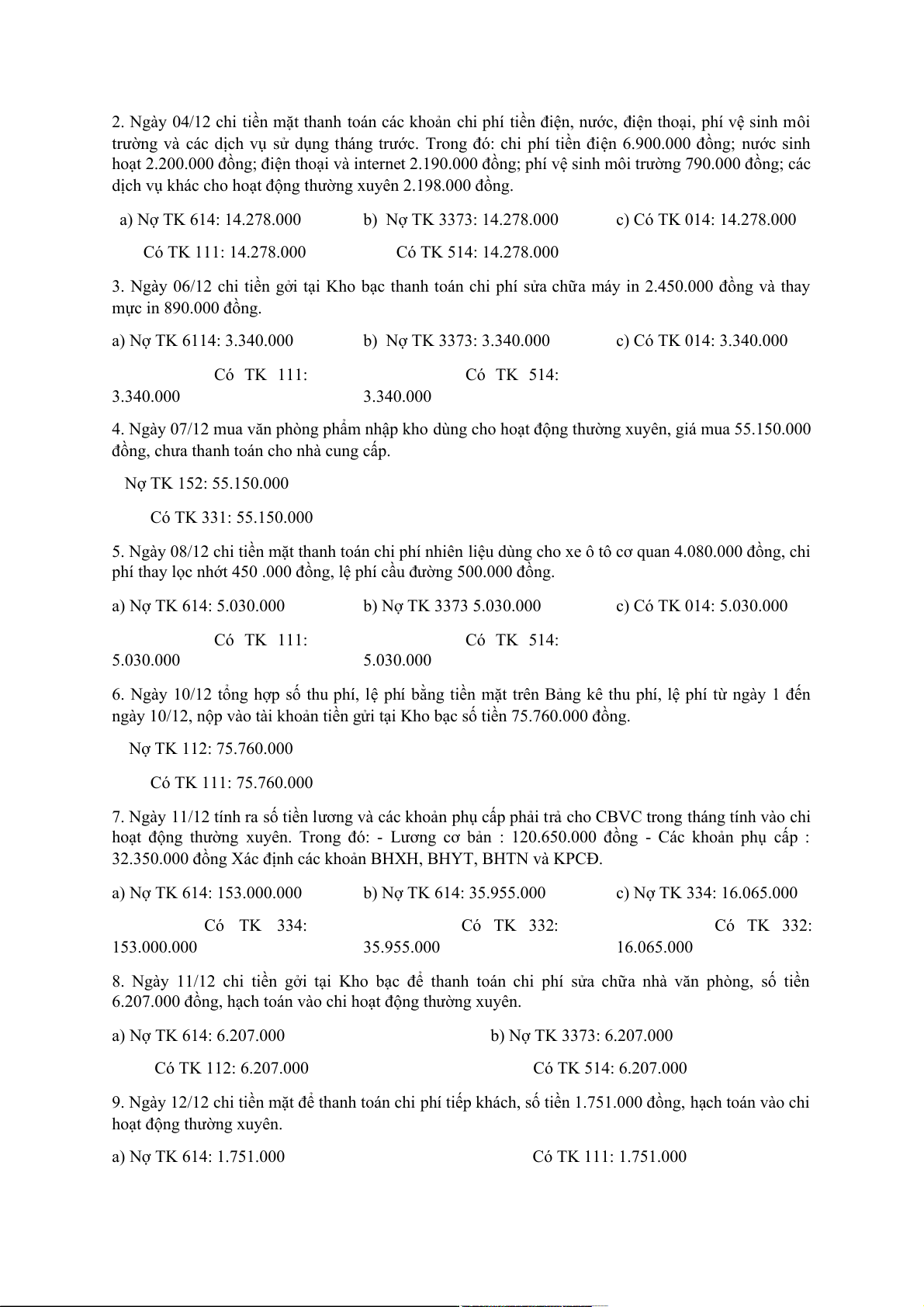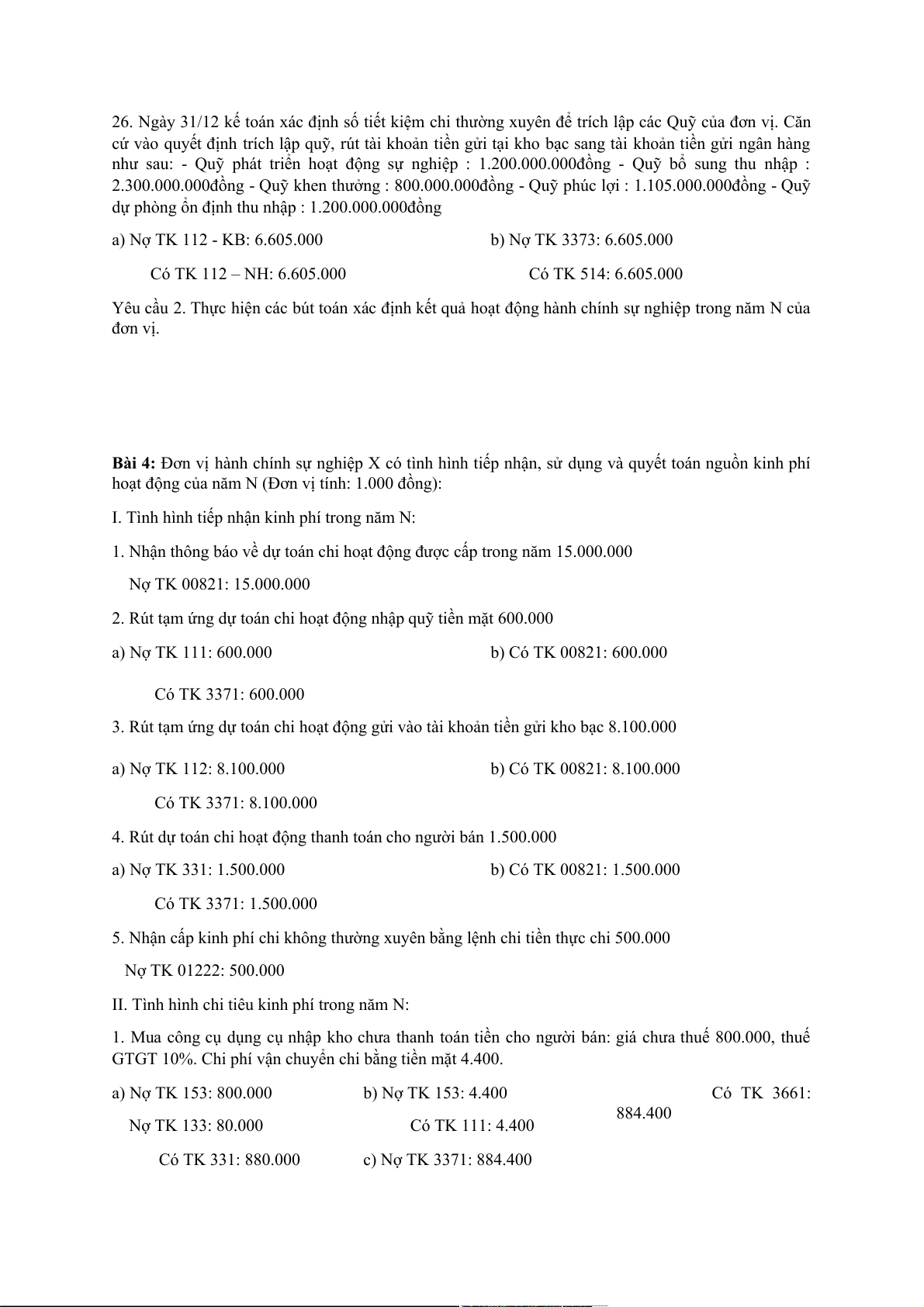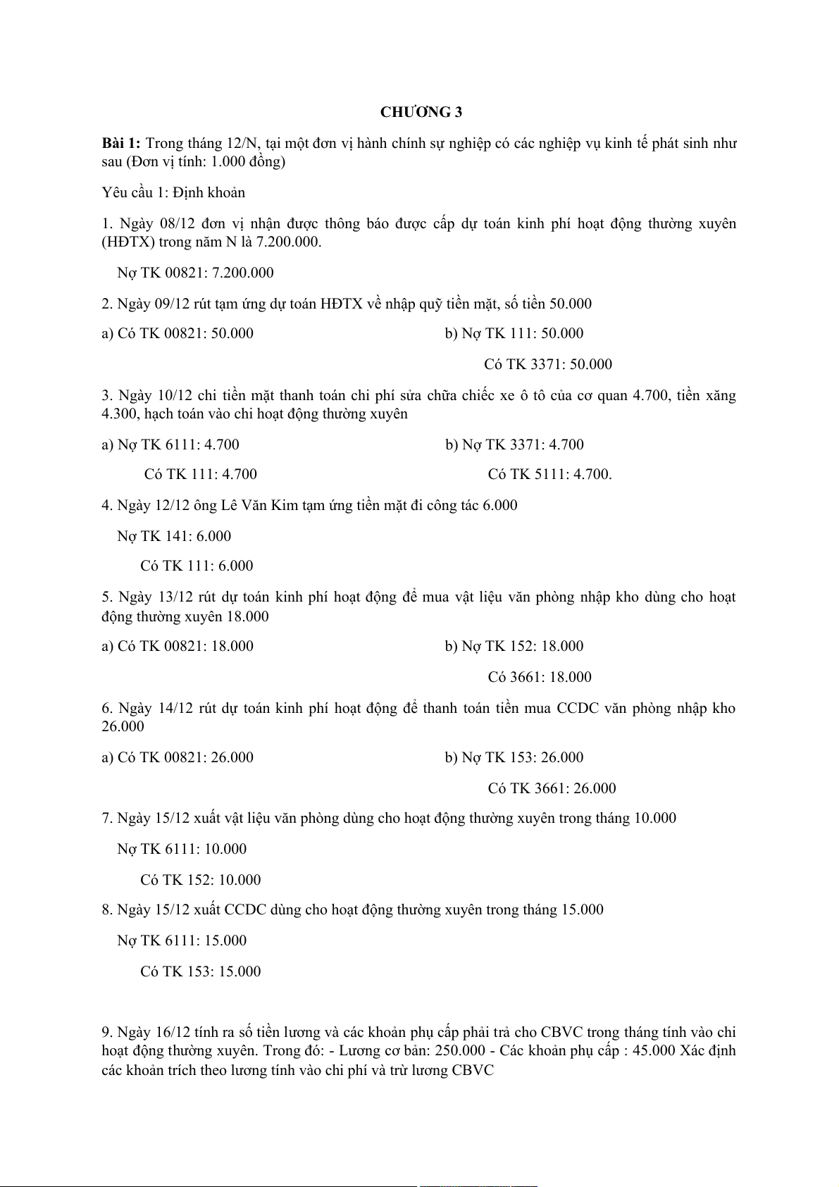Bài 1: Trong tháng 12/N, tại một đơn vị hành chính sự nghiệp có các nghiệp vụ kinh tế phát sinh như