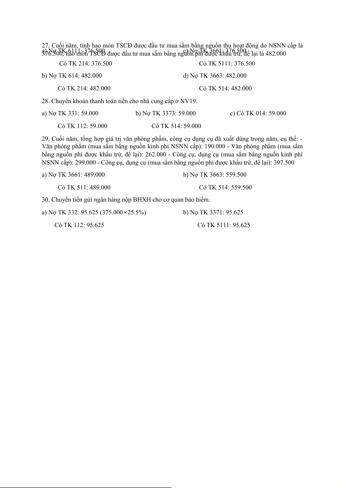 20. Ngày 31/12, tính tổng hao mòn/khấu hao của TSCĐ dùng cho hoạt động hành chính sự nghiệp của đơn vị là 27.000 a) Nợ TK 6111: 27.000 b) Nợ TK 3661: 27.000 Có TK 214: 27.000 Có TK 5111: 27.000