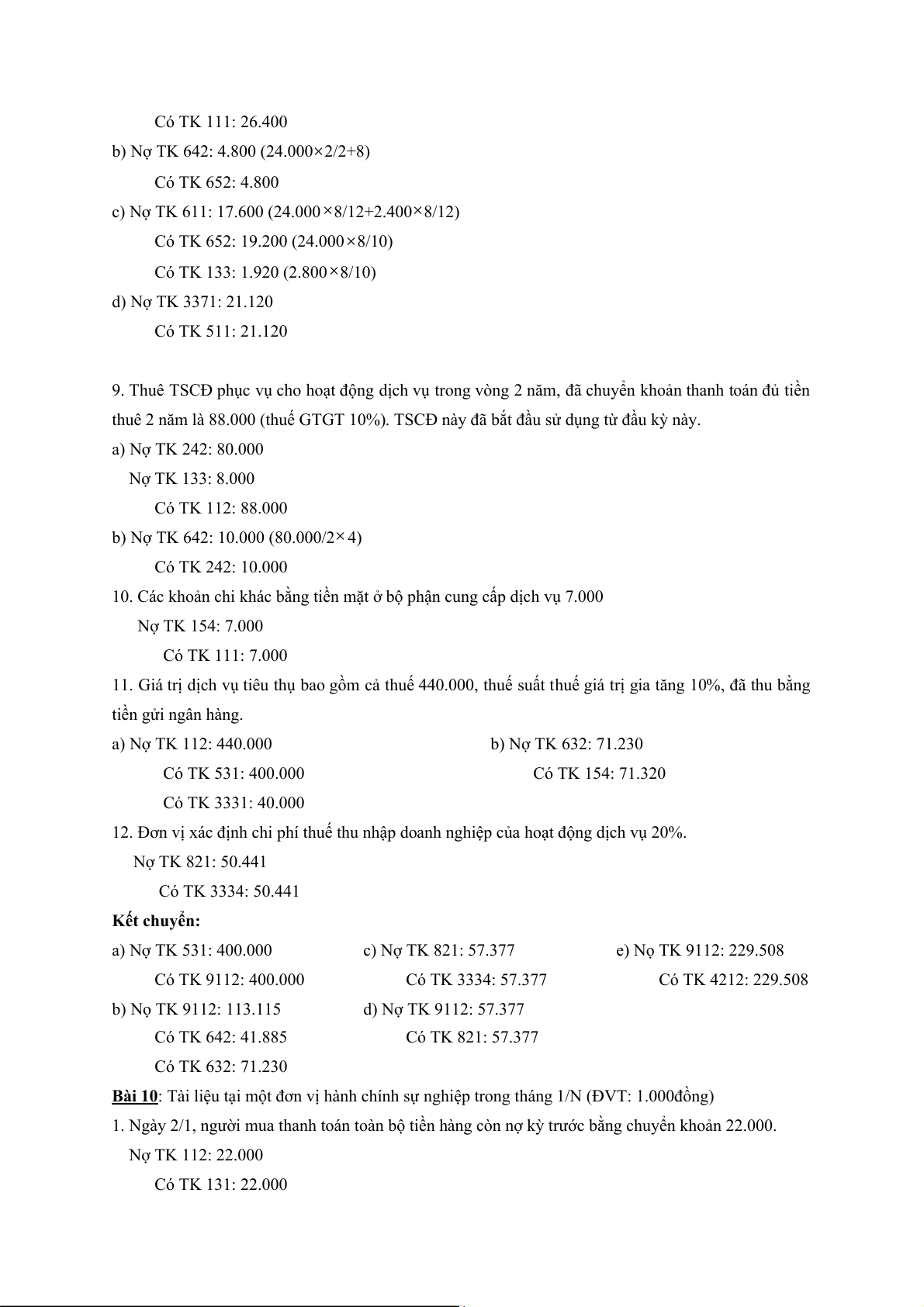 12. Đơn vị xác định chi phí thuế thu nhập doanh nghiệp của hoạt động dịch vụ 20%. Nợ TK 821: 50.441 Có TK 3334: 50.441 Kết chuyển: a) Nợ TK 531: 400.000 c) Nợ TK 821: 57.377 e) Nọ TK 9112: 229.508 Có TK 9112: 400.000 Có TK 3334: 57.377 Có TK 4212: 229.508 b) Nọ TK 9112: 113.115 d) Nợ TK 9112: 57.377 Có TK 642: 41.885 Có TK 821: 57.377 Có TK 632: 71.230