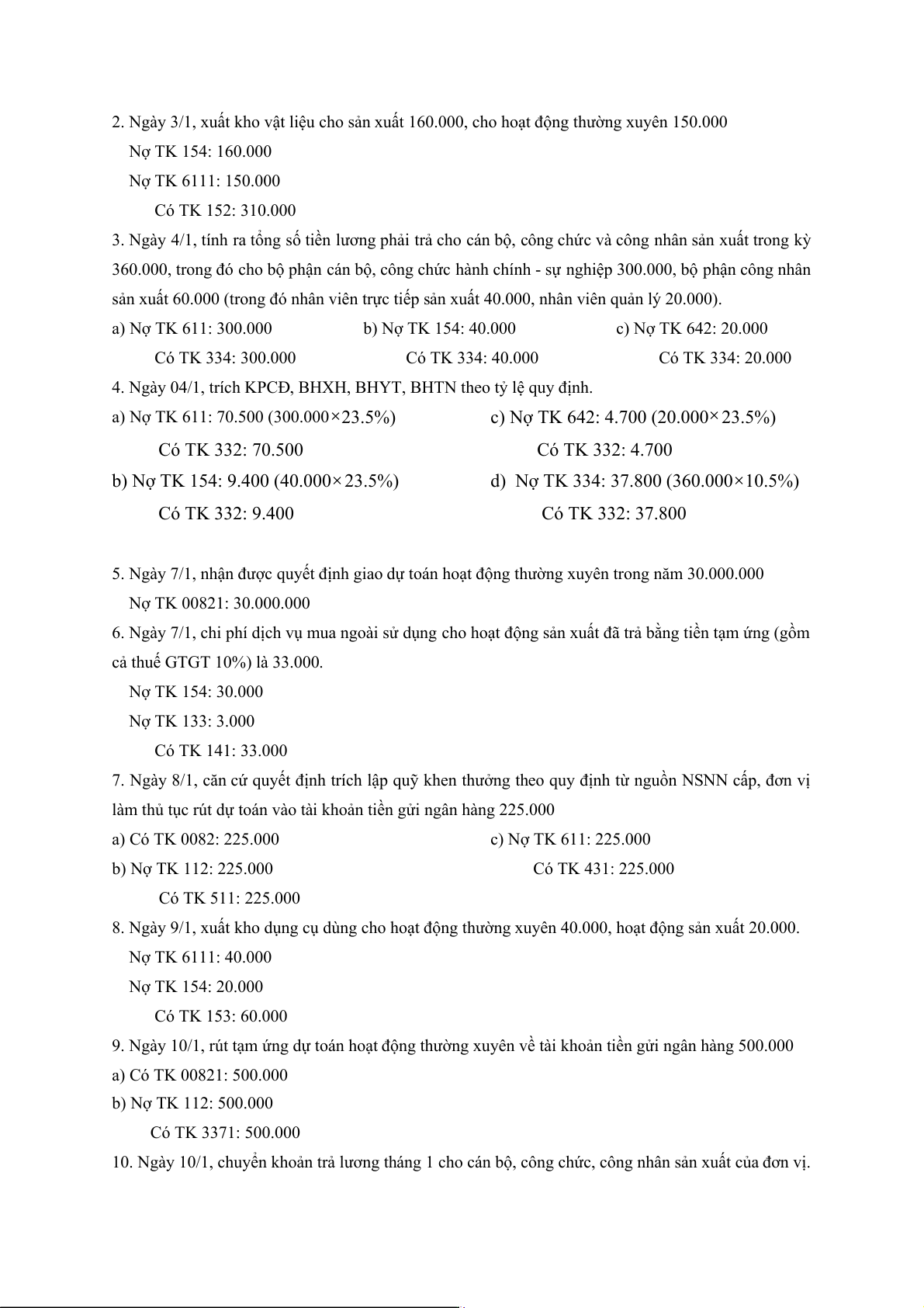 10. Ngày 10/1, chuyển khoản trả lương tháng 1 cho cán bộ, công chức, công nhân sản xuất của đơn vị.
