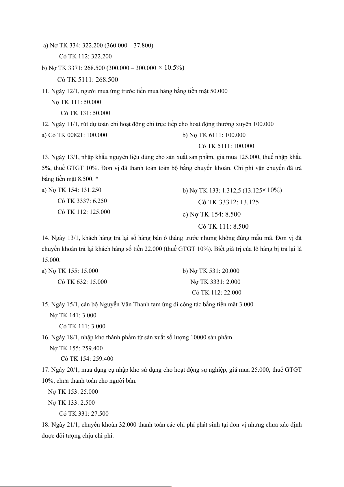 12. Ngày 11/1, rút dự toán chi hoạt động chi trực tiếp cho hoạt động thường xuyên 100.000 a) Có TK 00821: 100.000 b) Nợ TK 6111: 100.000 Có TK 5111: 100.000
