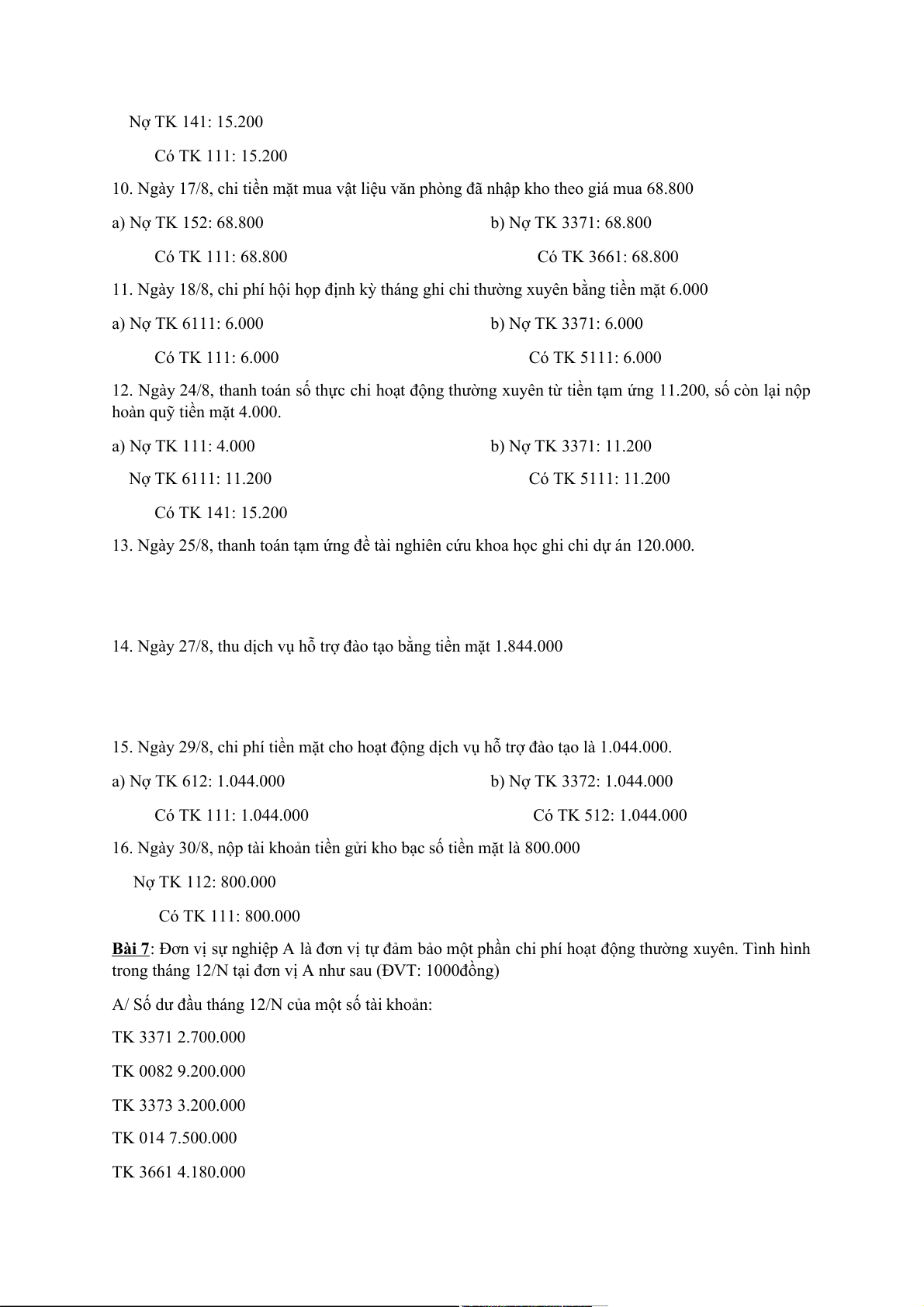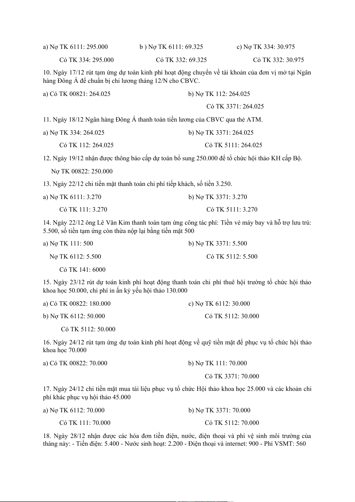16. Ngày 24/12 rút tạm ứng dự toán kinh phí hoạt động về quỹ tiền mặt để phục vụ tổ chức hội thảo khoa học 70.000 a) Có TK 00822: 70.000 b) Nợ TK 111: 70.000 Có TK 3371: 70.000
