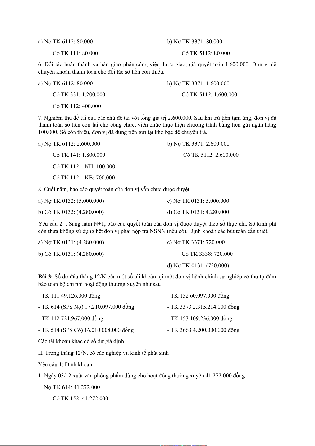 8. Cuối năm, báo cáo quyết toán của đơn vị vẫn chưa được duyệt a) Nợ TK 0132: (5.000.000) c) Nợ TK 0131: 5.000.000 b) Có TK 0132: (4.280.000) d) Có TK 0131: 4.280.000
