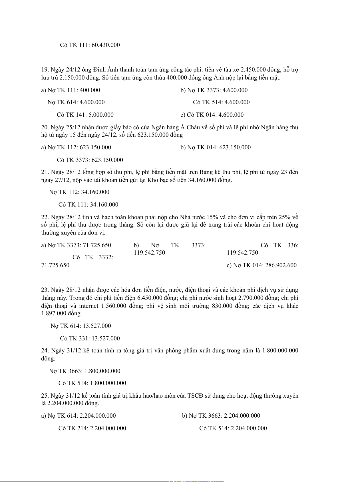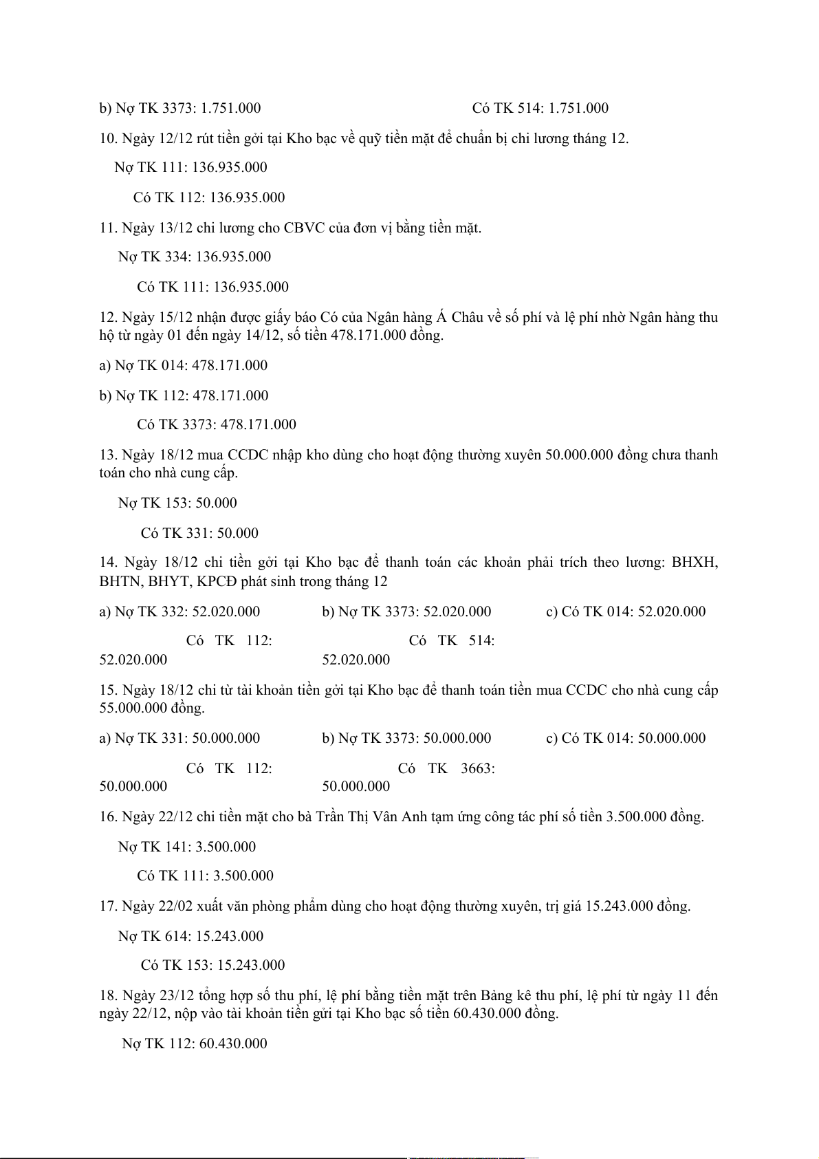 15. Ngày 18/12 chi từ tài khoản tiền gởi tại Kho bạc để thanh toán tiền mua CCDC cho nhà cung cấp 55.000.000 đồng. a) Nợ TK 331: 50.000.000 b) Nợ TK 3373: 50.000.000 c) Có TK 014: 50.000.000 Có TK 112: Có TK 3663: 50.000.000 50.000.000