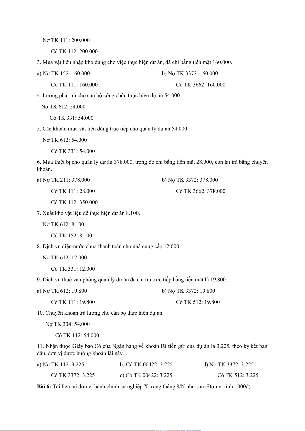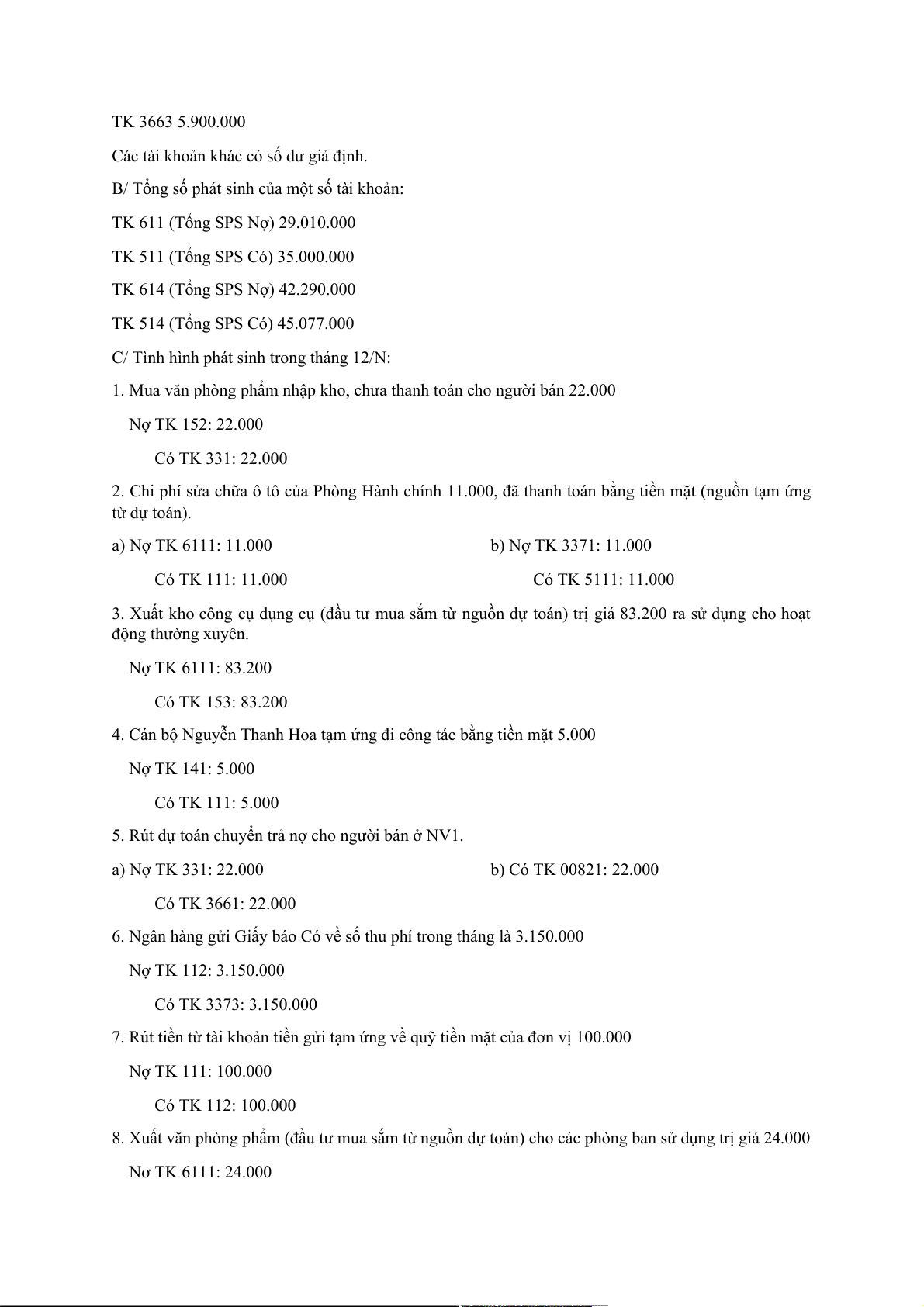 2. Chi phí sửa chữa ô tô của Phòng Hành chính 11.000, đã thanh toán bằng tiền mặt (nguồn tạm ứng từ dự toán). a) Nợ TK 6111: 11.000 b) Nợ TK 3371: 11.000 Có TK 111: 11.000 Có TK 5111: 11.000