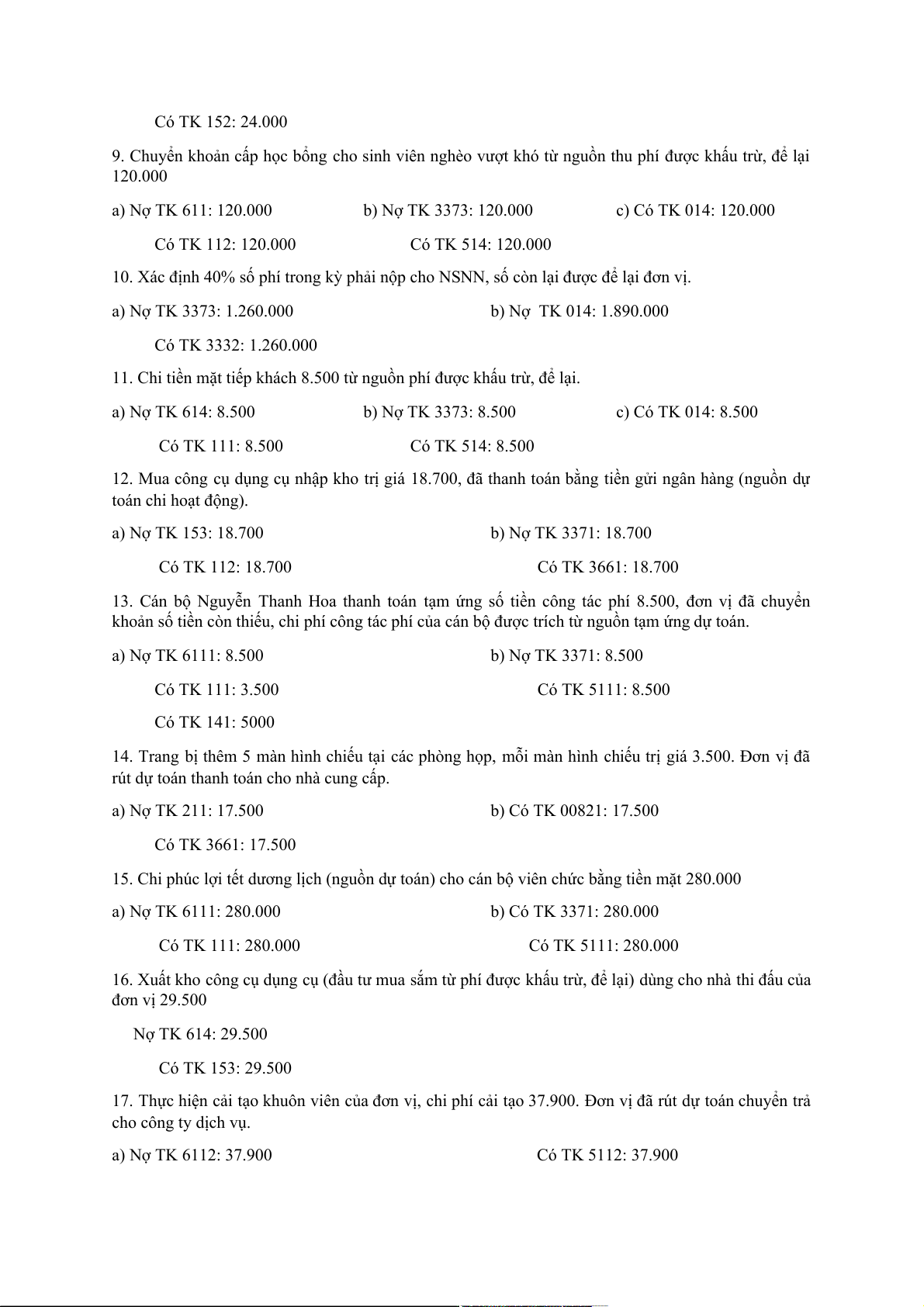 9. Chuyển khoản cấp học bổng cho sinh viên nghèo vượt khó từ nguồn thu phí được khấu trừ, để lại 120.000 a) Nợ TK 611: 120.000 b) Nợ TK 3373: 120.000 c) Có TK 014: 120.000 Có TK 112: 120.000 Có TK 514: 120.000