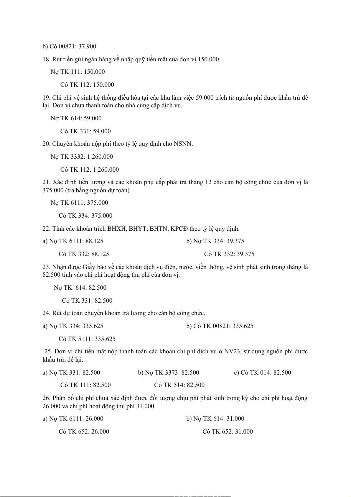 24. Rút dự toán chuyển khoản trả lương cho cán bộ công chức. a) Nợ TK 334: 335.625 b) Có TK 00821: 335.625 Có TK 5111: 335.625