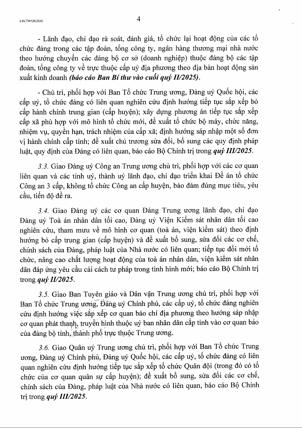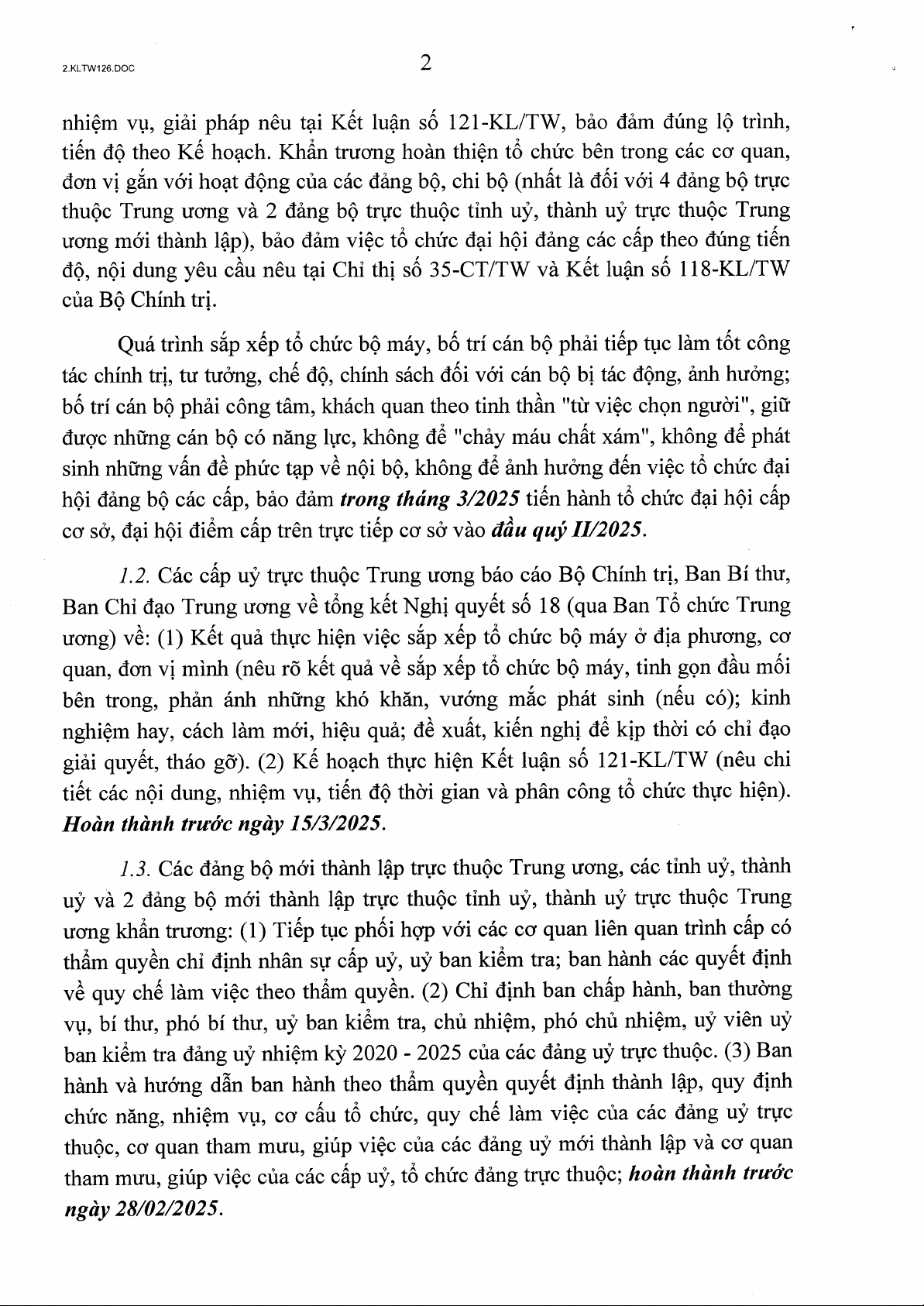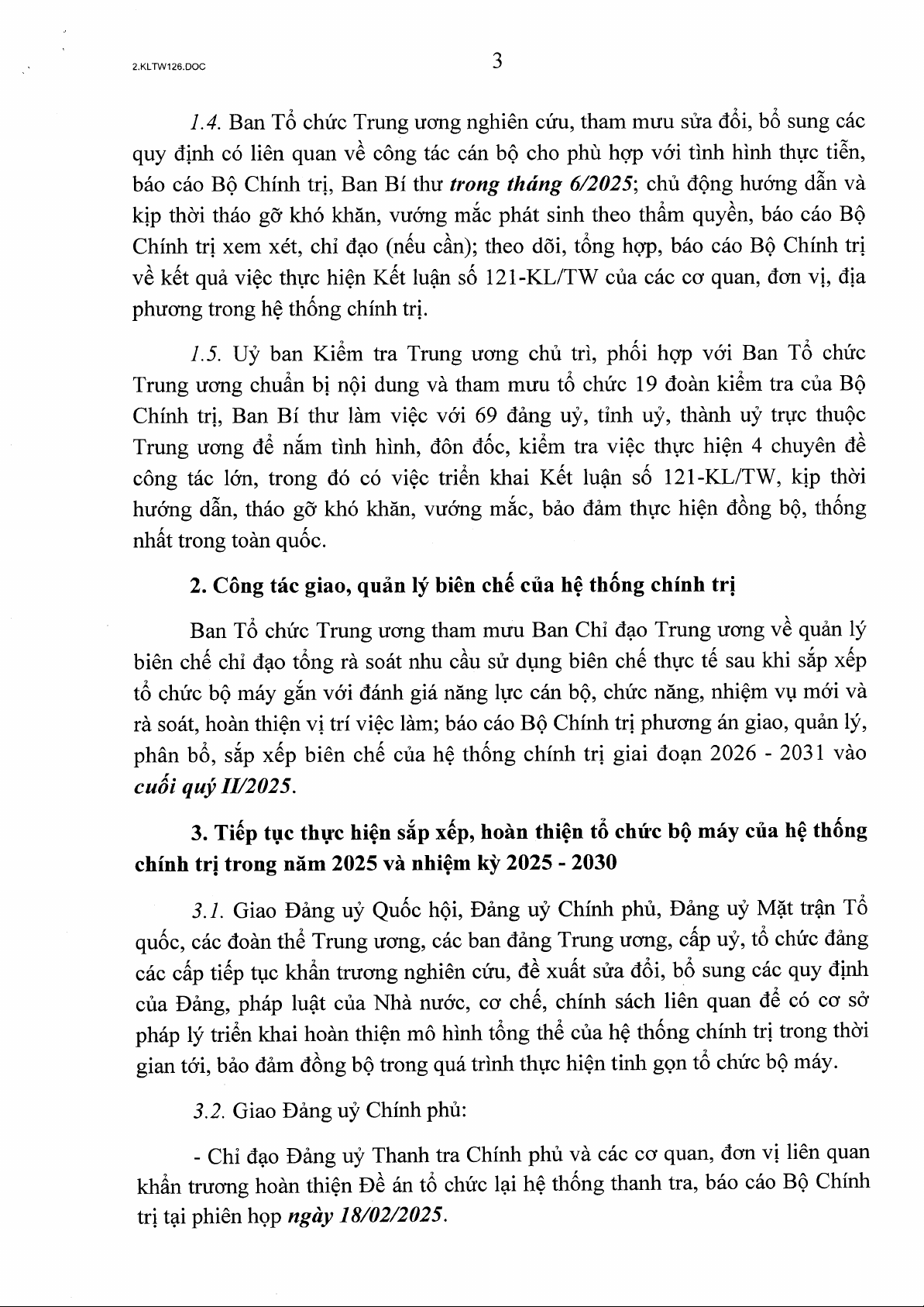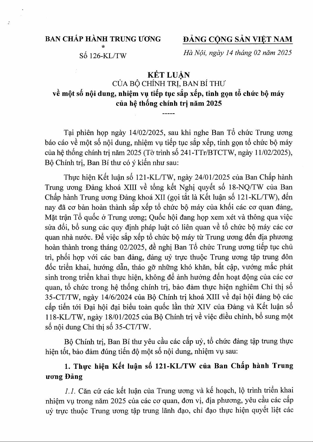 Kết luận số 126-KL/TW ngày 14/02/2025 của Bộ Chính trị, Ban Bí thư về một số nội dung, nhiệm vụ tiếp tục sắp xếp, tinh gọn tổ chức bộ máy của hệ thống chính trị năm 2025