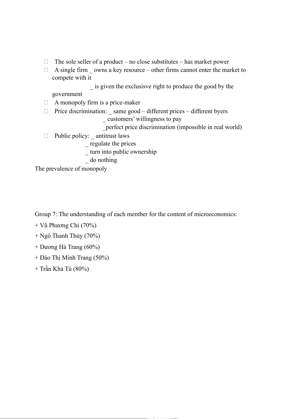 Group 7: The understanding of each member for the content of microeconomics: + Vũ Phương Chi (70%) + Ngô Thanh Thủy (70%) + Dương Hà Trang (60%) + Đào Thị Minh Trang (50%) + Trần Khả Tú (80%)