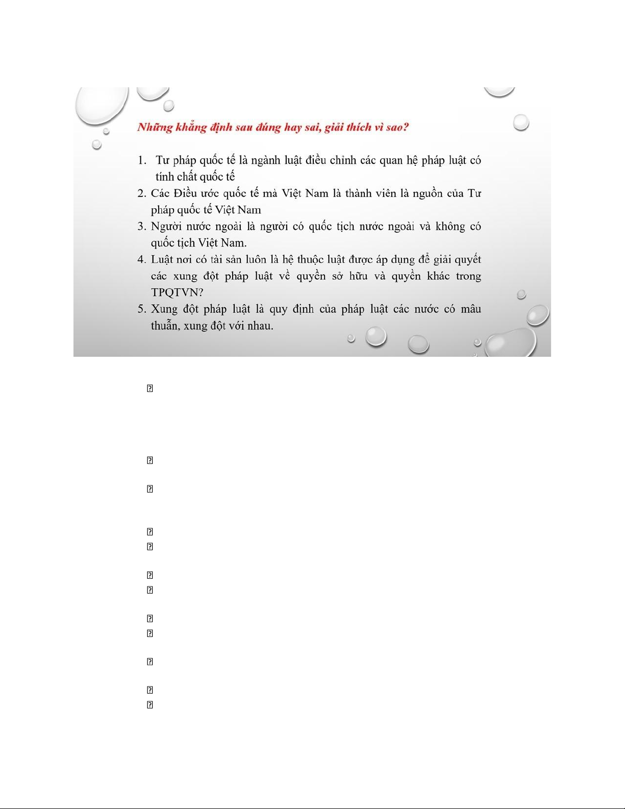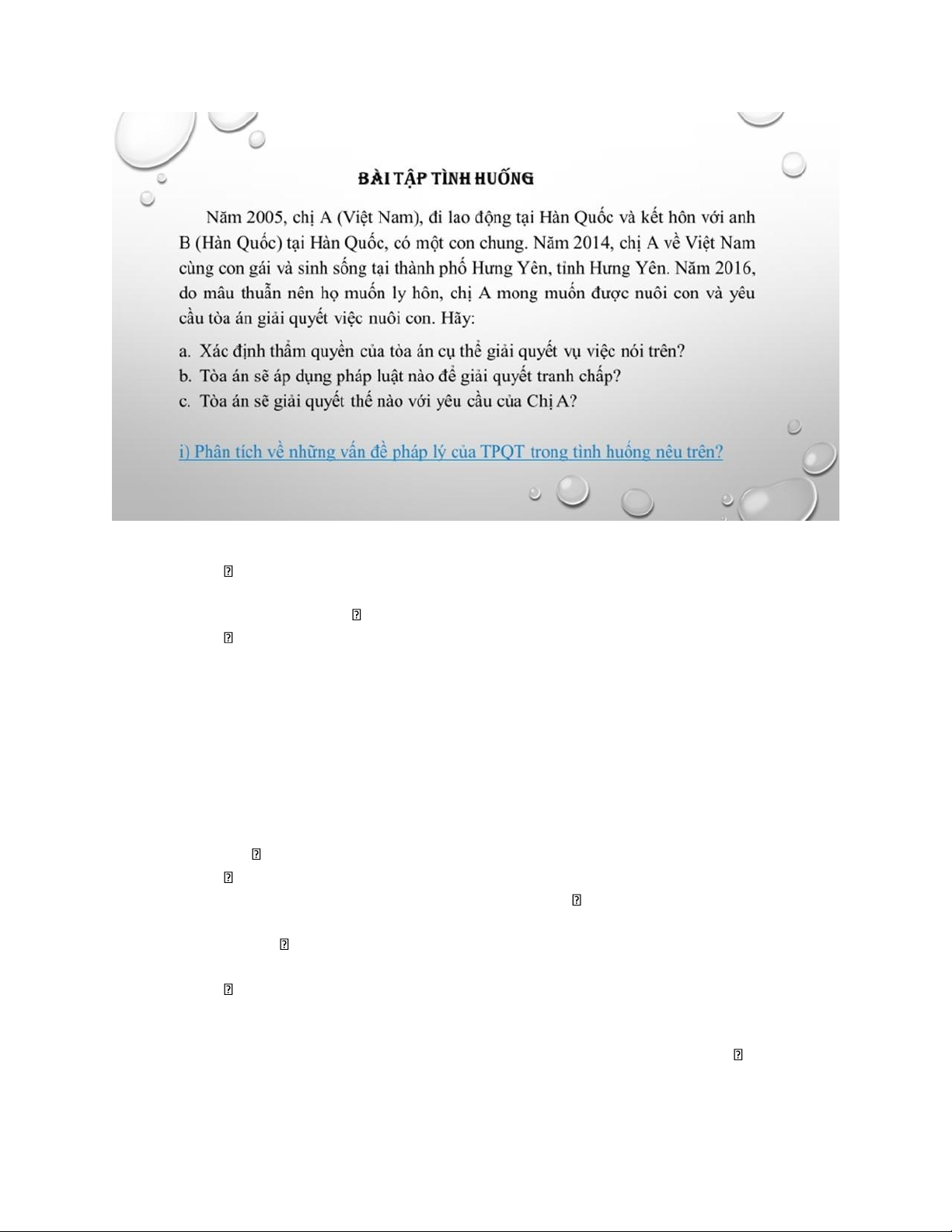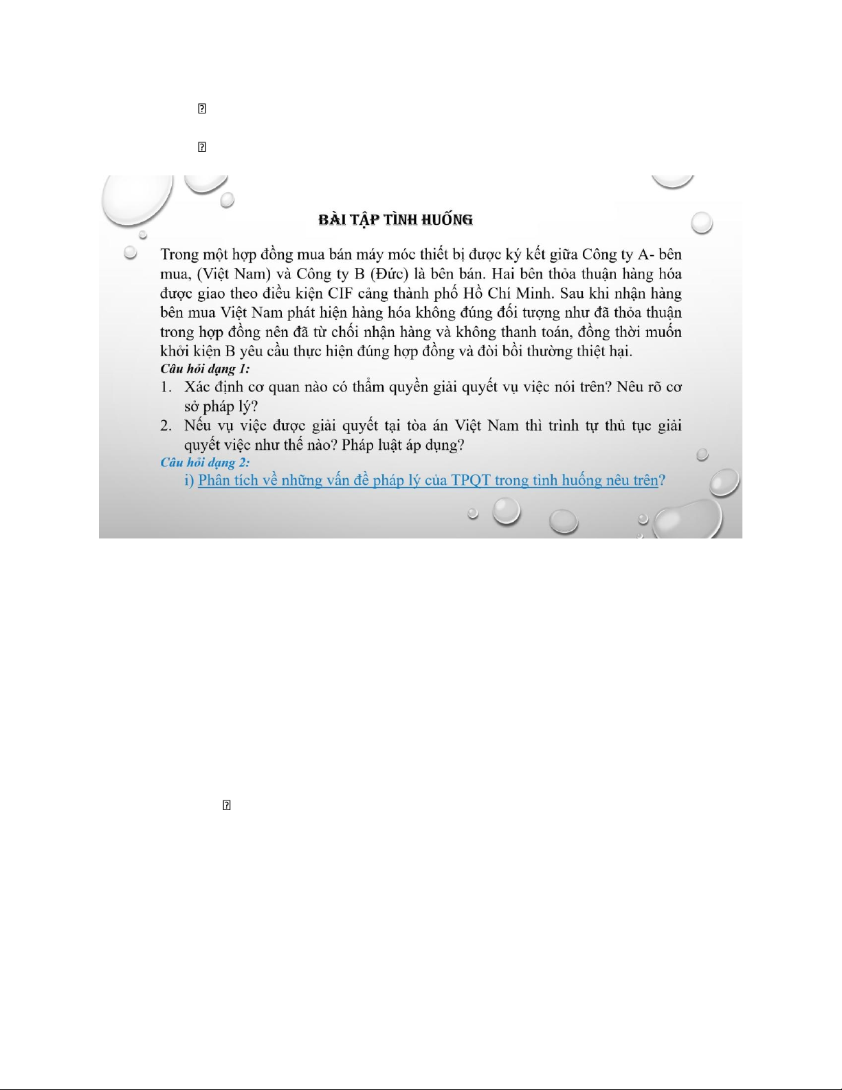 Nếu không có công ước -> quay về pháp luật quốc gia quy định tại Điều 683 nơi có pháp luật gắn bó nhất. Câu hỏi dạng 2: -