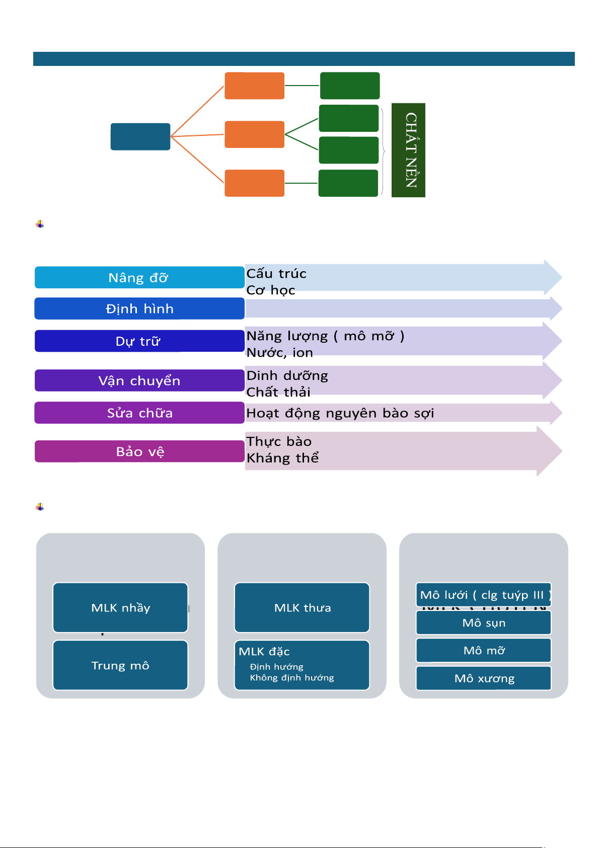 7 Nang tuyến : do phần chế tiết phình ra lOMoAR cPSD| 47207367 BIỂU MÔ Tế bào 9 loại tế liên kết bào Sợi Sợi liên collagen CẤU TẠO kết Sợi chun Chất căn Gel ưa bản nước CHỨC NĂNG : PHÂN LOẠI lOMoAR cPSD| 47207367 MÔ LIÊN KẾT CHẤT CĂN BẢN Cấu tạo Chức năng