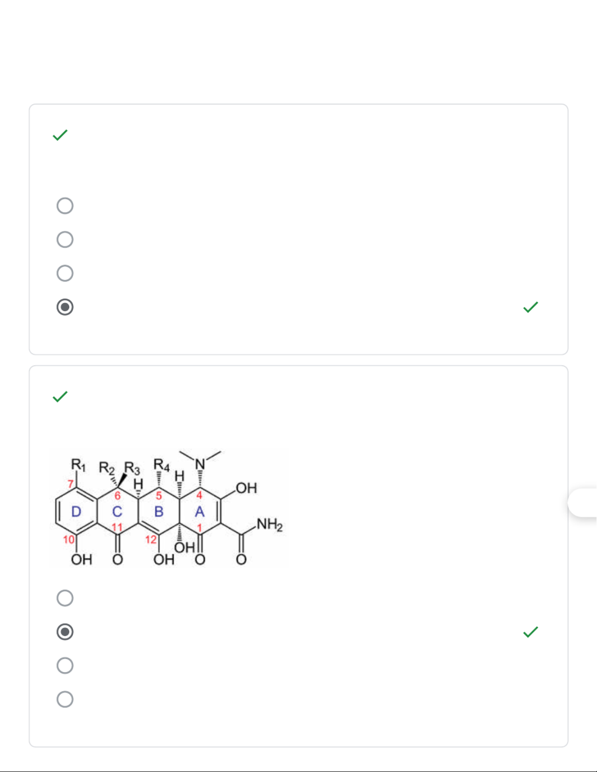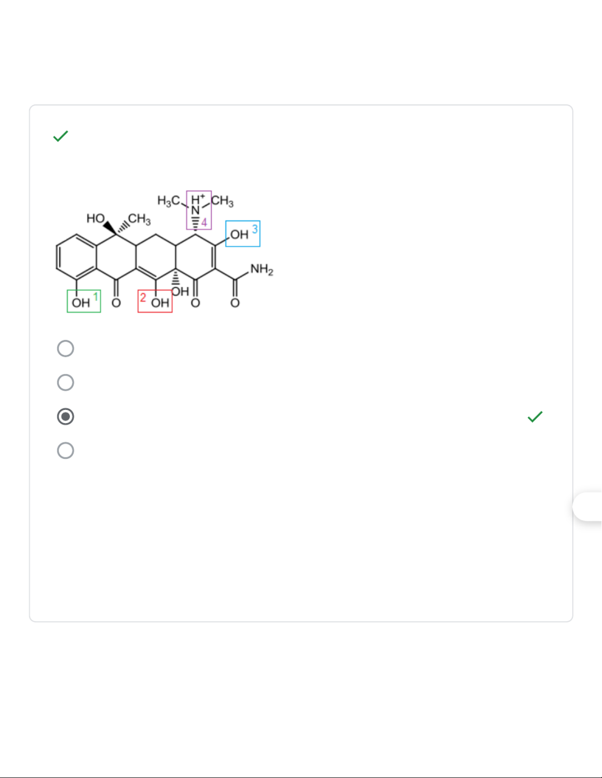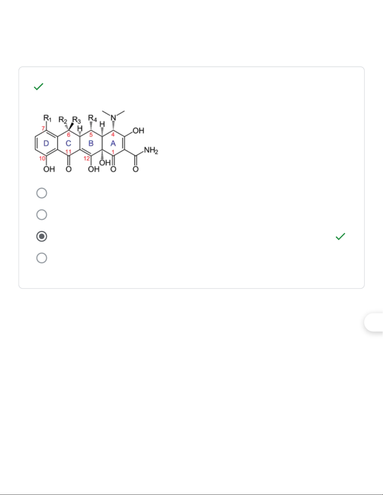 Nhóm cấu trúc nào sau đây không phải là đặc điểm cấu trúc chung của 1/1 các tetracyclin? Nhóm OH phenol Nhóm amin bậc 3 Nhóm ceton Nhóm acid COOH