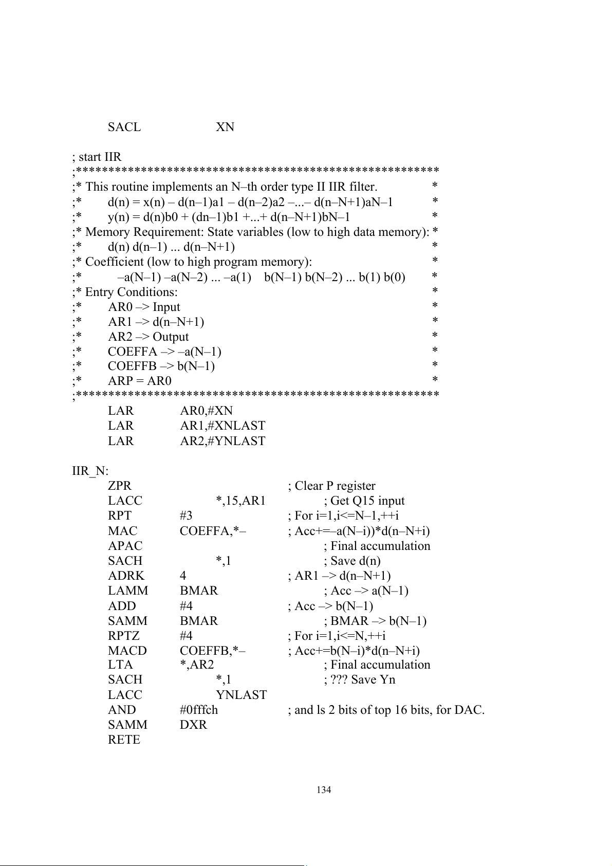 ; Acc+=–a(N–i))*d(n–N+i) APAC ; Final accumulation SACH *,1 ; Save d(n) ADRK 4 ; AR1 –> d(n–N+1) LAMM BMAR ; Acc –> a(N–1) ADD #4 ; Acc –> b(N–1) SAMM BMAR ; BMAR –> b(N–1) RPTZ #4 ; For i=1,i<=N,++i MACD COEFFB,*– ; Acc+=b(N–i)*d(n–N+i) LTA *,AR2 ; Final accumulation SACH *,1 ; ??? Save Yn LACC YNLAST AND #0fffch