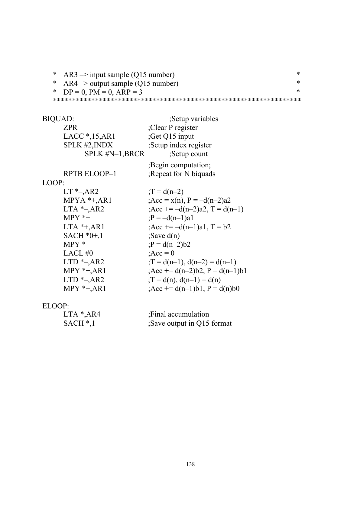 ;Acc += d(n–1)b1, P = d(n)b0 ELOOP: LTA *,AR4 ;Final accumulation SACH *,1 ;Save output in Q15 format 138